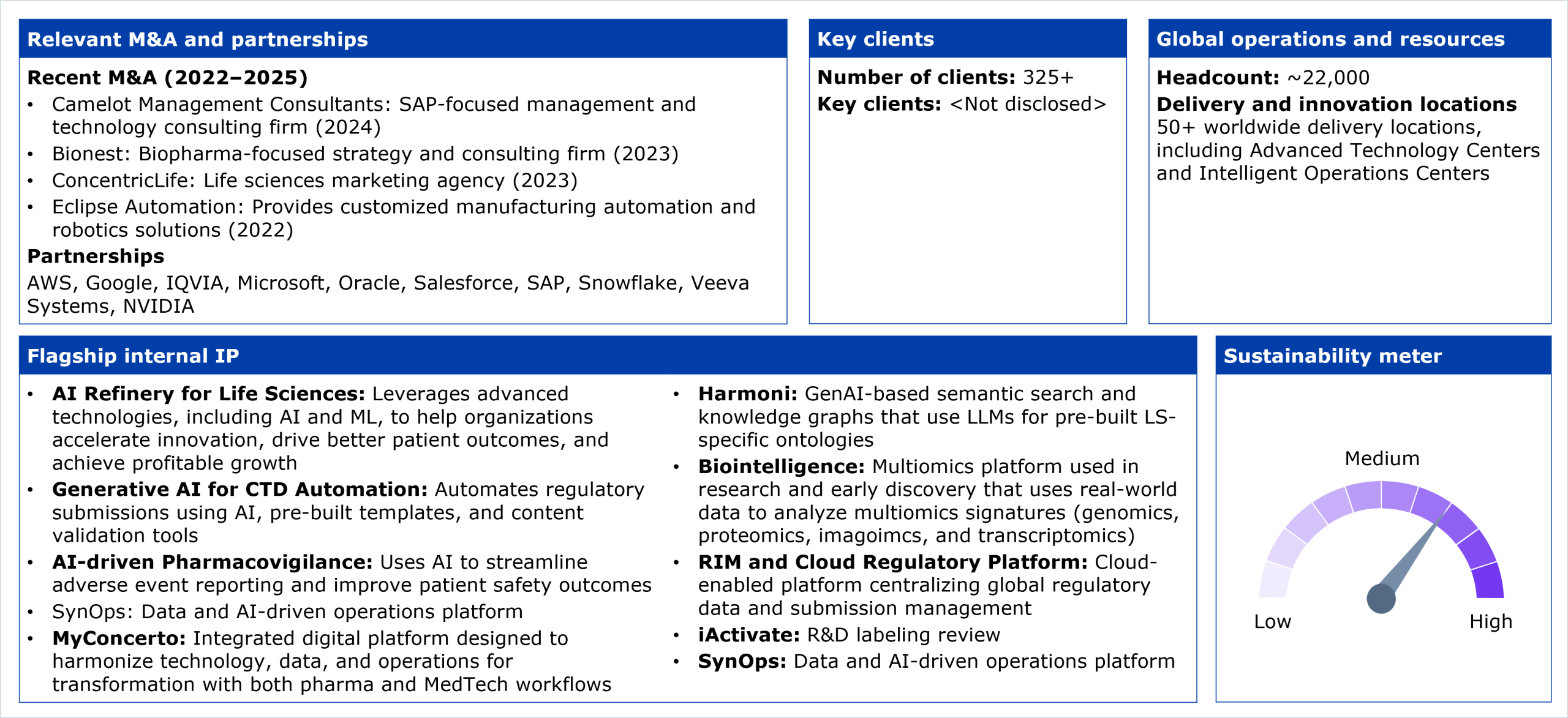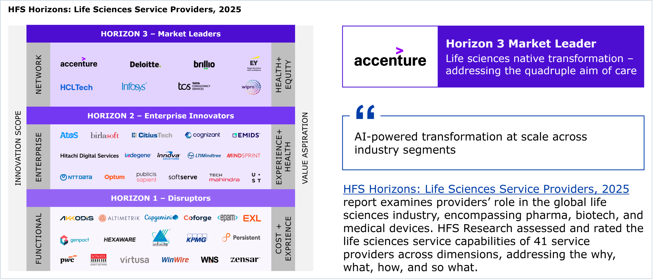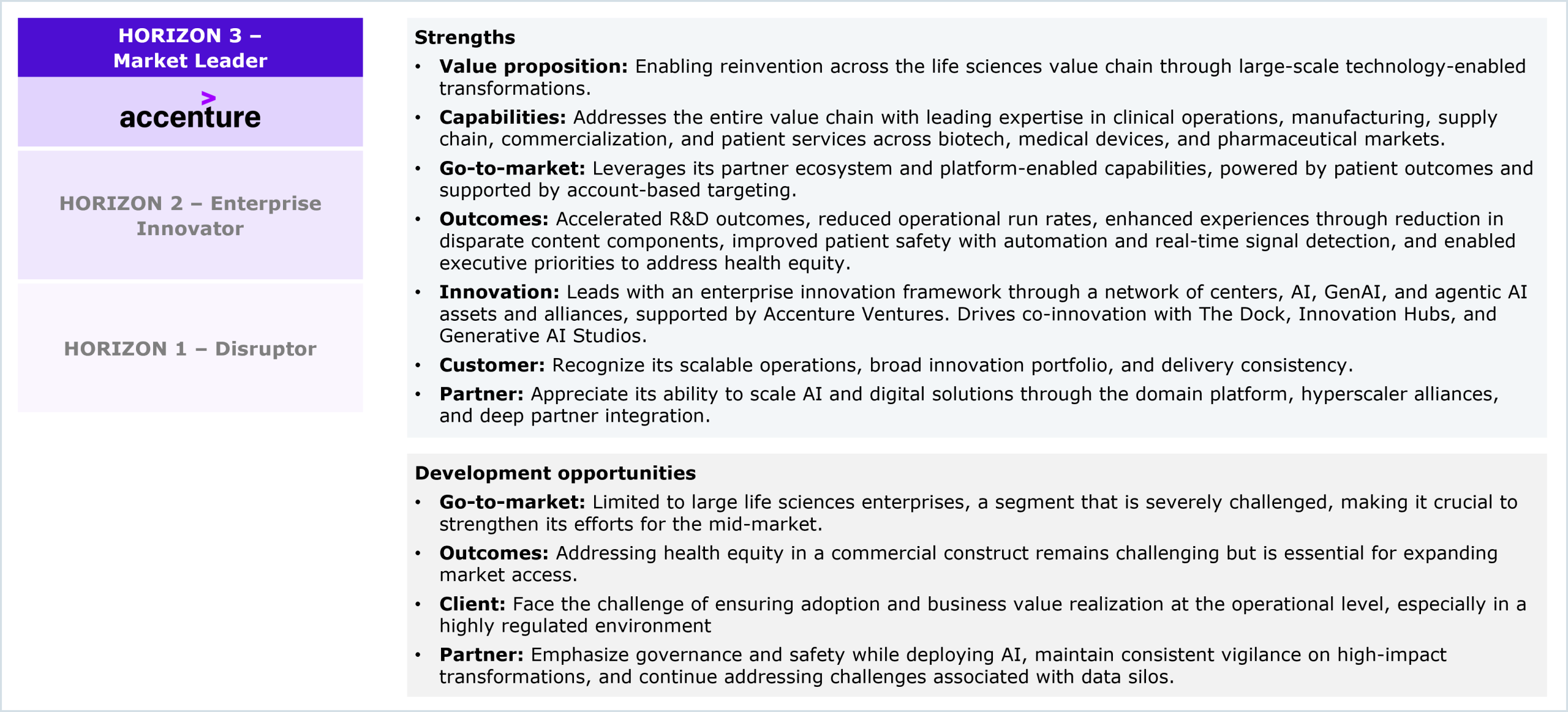 Accenture’s performance in the study and HFS’ views of its strengths and development opportunities for life sciences service capabilities