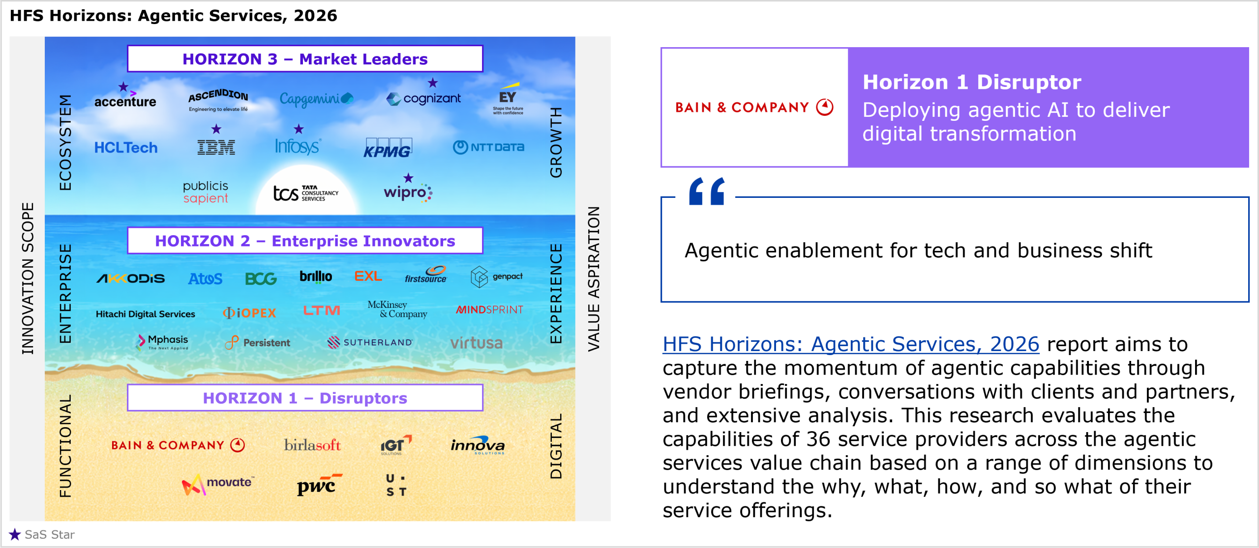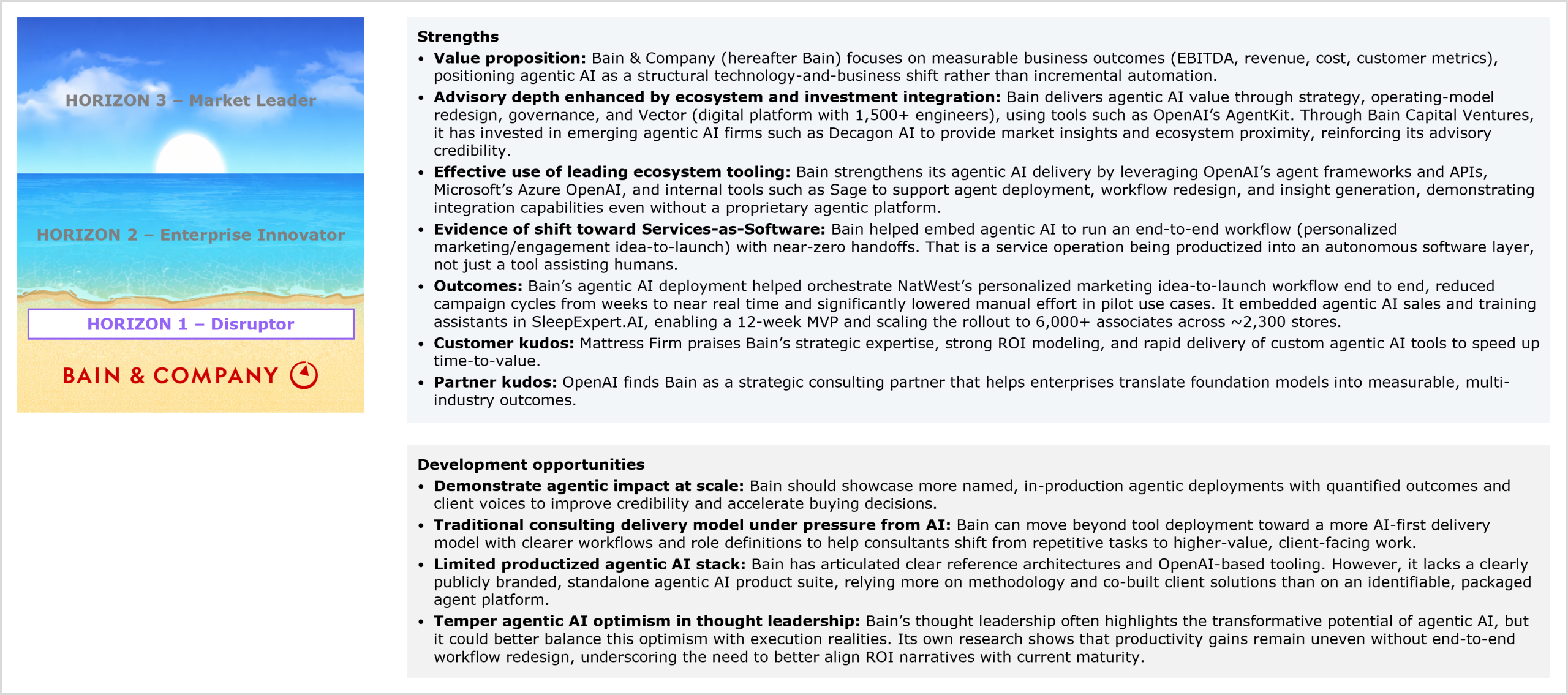 Bain & Company’s performance in the study and HFS’ views of its strengths and development opportunities for agentic services capabilities