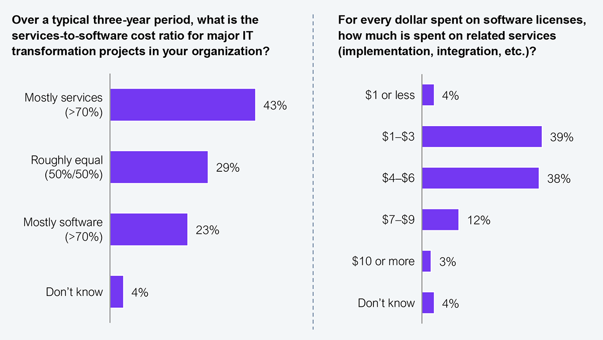 Across major transformation programs across the banking, financial services, and insurance industry (BFSI), the cost structure tells a clear story. Services and integration work consume most of the transformation budgets. In a recent HFS study of 69 BFSI decision makers, 43% reported that more than 70% of project spend goes to services rather than software over a typical three-year transformation cycle. Only 23% reported software-led programs in which licenses accounted for the dominant share. Most organizations indicated that for every dollar invested in software licenses, they spend between three and six dollars on related services such as implementation and integration (see Exhibit 1).