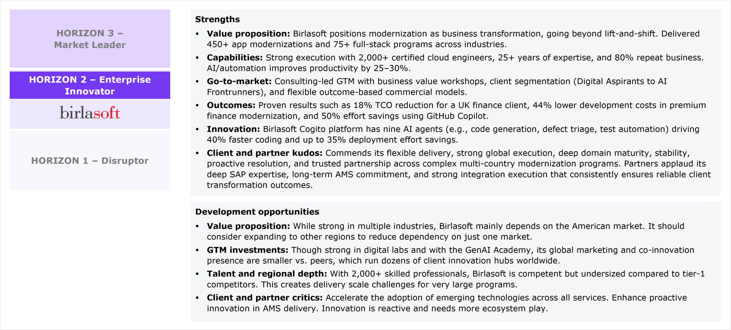 Birlasoft’s strengths and development opportunities, as per HFS’ analysis, in legacy application modernization services capabilities