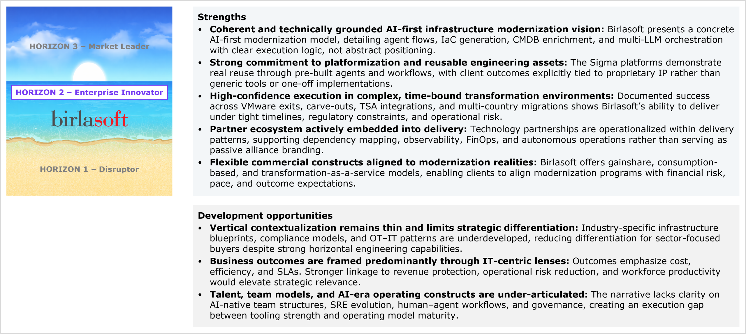 Birlasoft’s performance in the study and HFS’ views of its strengths and development opportunities for next-gen IT infrastructure services capabilities