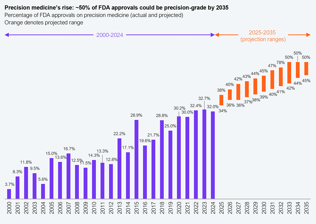 Projections indicate that by 2035, around 50% of all approvals could be precision-grade (see Exhibit 1). The numbers make the shift clear: precision therapies accounted for only 3.7% of drug approvals in 2000 and surged to 32% in 2024, a near tenfold increase. This isn’t just a minor trend; it represents the future of pharmaceutical pipelines.