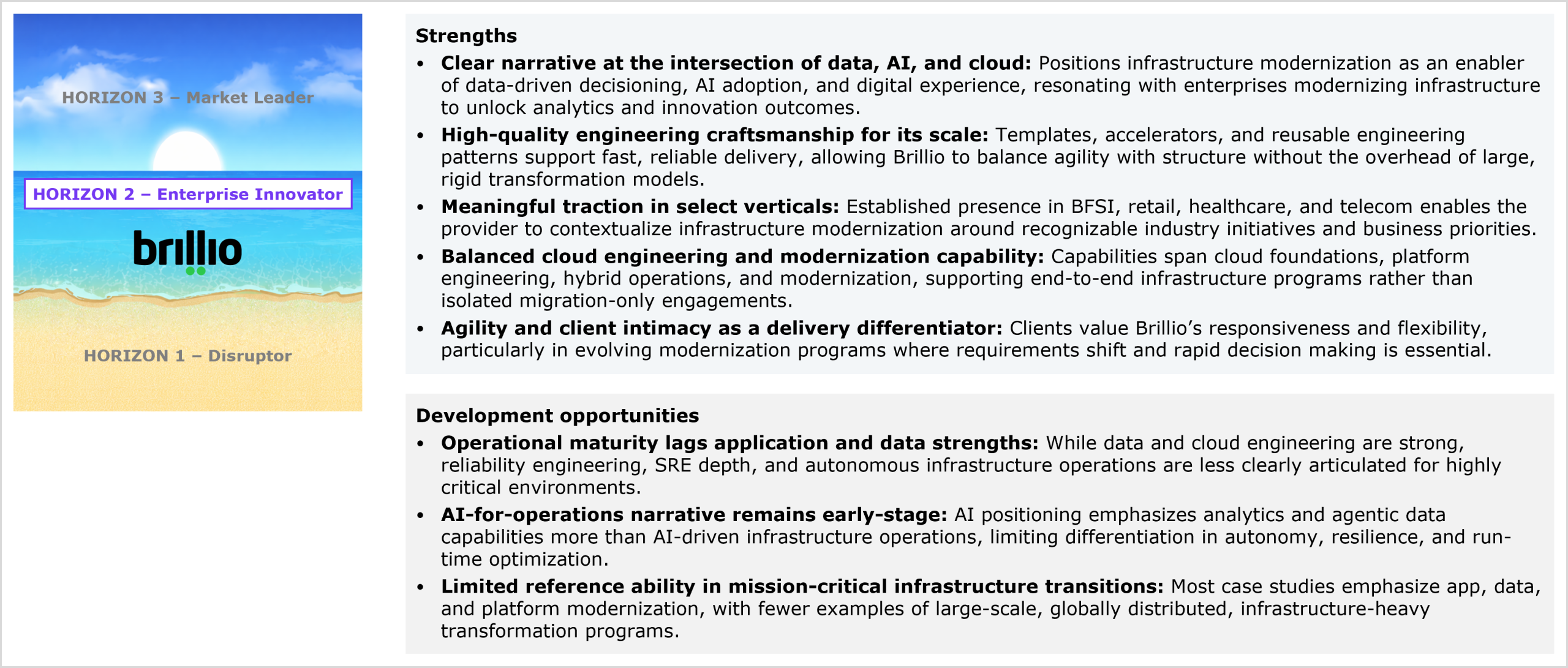 Brillio’s performance in the study and HFS’ views of its strengths and development opportunities for next-gen IT infrastructure services capabilities