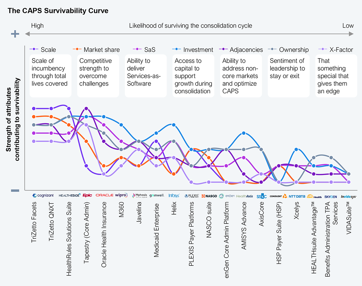 We analyzed 18 CAPS across seven dimensions: scale, market share, ability to deliver through SaS, access to capital, value to adjacent markets, ownership sentiment, and that special something. The market is likely to consolidate over the next 24 to 36 months to about 50% of the current list, as health plans’ shifting priorities clash with CAPS vendors’ inability to support them (see Exhibit 4).