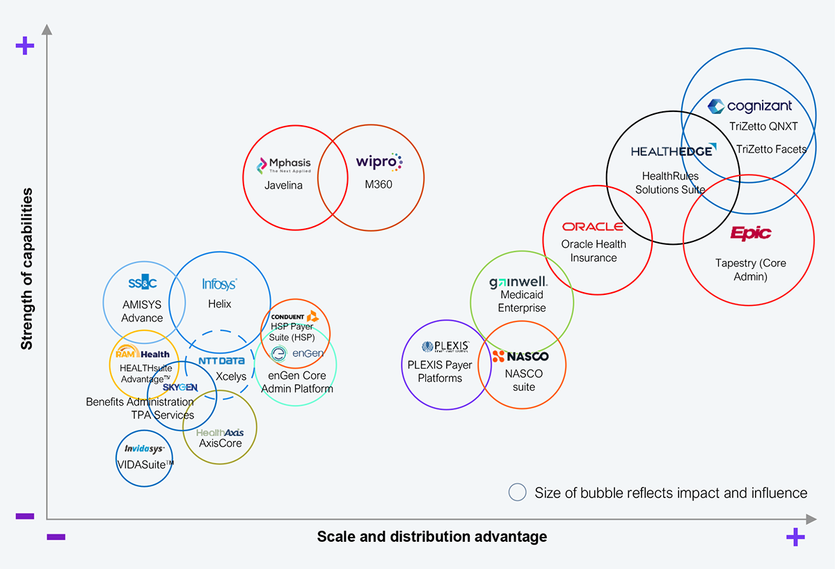 Over the last 40 years, approximately 20 CAPS providers have participated at some scale, delivering platforms, services, and functions to health plans. Exhibit 4 shows the current CAPS vendors at the intersection of their capabilities and distribution advantage. The chart is a retrospective view of market perception. While it is not indicative of CAPS vendors’ future success or lack thereof, it certainly provides a foundation for what might happen with their products.