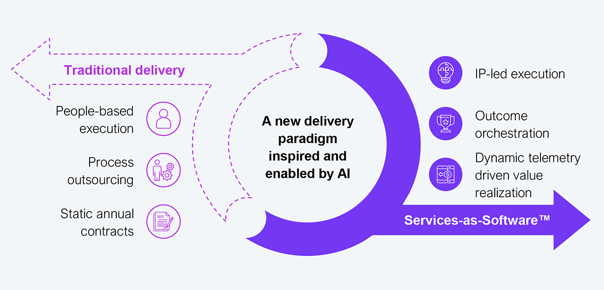 Services-as-Software™ (SaS) will be the preeminent 21st-century AI-enabled delivery model (see Exhibit 3) that will be central for health plans to effectively and consistently maximize the potential of AI. SaS is how the transition from predominantly people-led to IP-led delivery will take place. SaS is about delivering outcomes that matter through ecosystem orchestration rather than features and functionality. SaS is about continuously realizing value, reflected in real-time telemetry rather than static annual contracts. This is a paradigm increasingly adopted across the technology landscape, as regulations and compliance are built in as table stakes.
