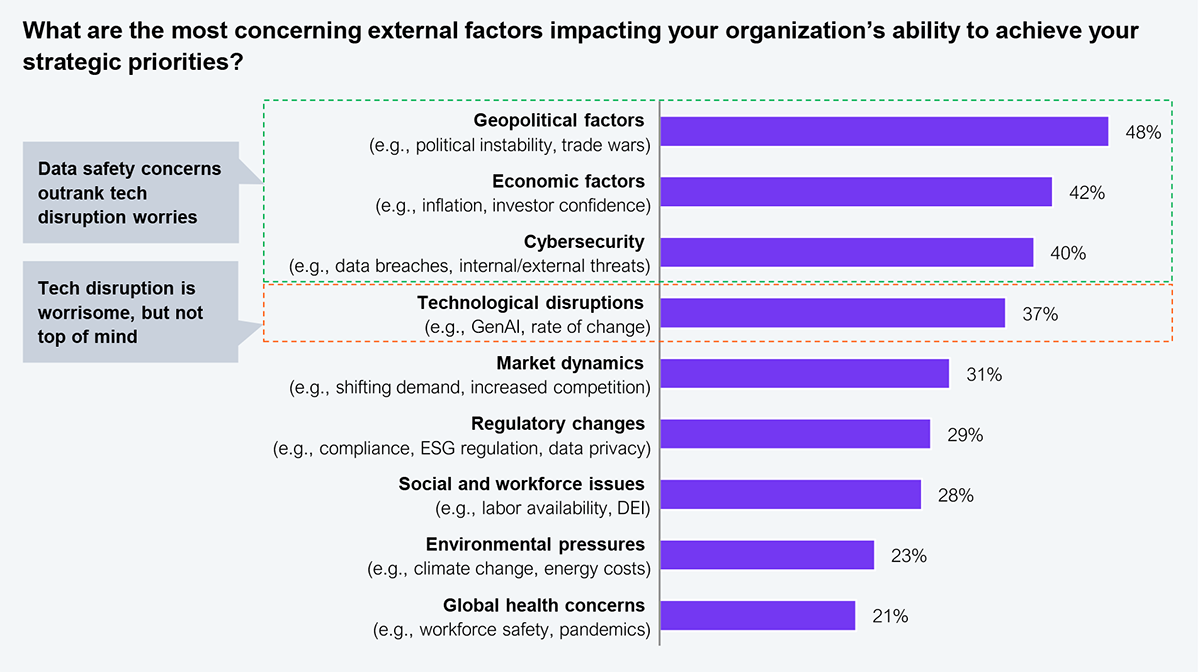 In a recent HFS Pulse study (see Exhibit 1), when we asked leaders from 200 global enterprises about external factors shaping their organizations’ ability to achieve strategic goals, three factors stood out in their answers. These factors—geopolitical, economic, and security—reflect an undercurrent of concern about the safety of the data their businesses run on. To define actions for the CEO and their teams, we must look beyond current politics and into the international laws that have set the stage for these actions.