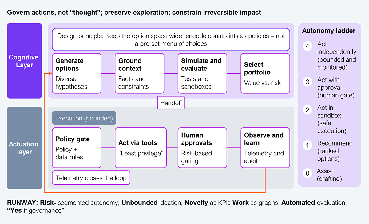 Unbounded ideation, bounded execution: Instead of narrowing the range of cognition, your job is to focus on creating policy gates, tools, and telemetry to act as the controls on selection and action across the cognition and actuation layers.