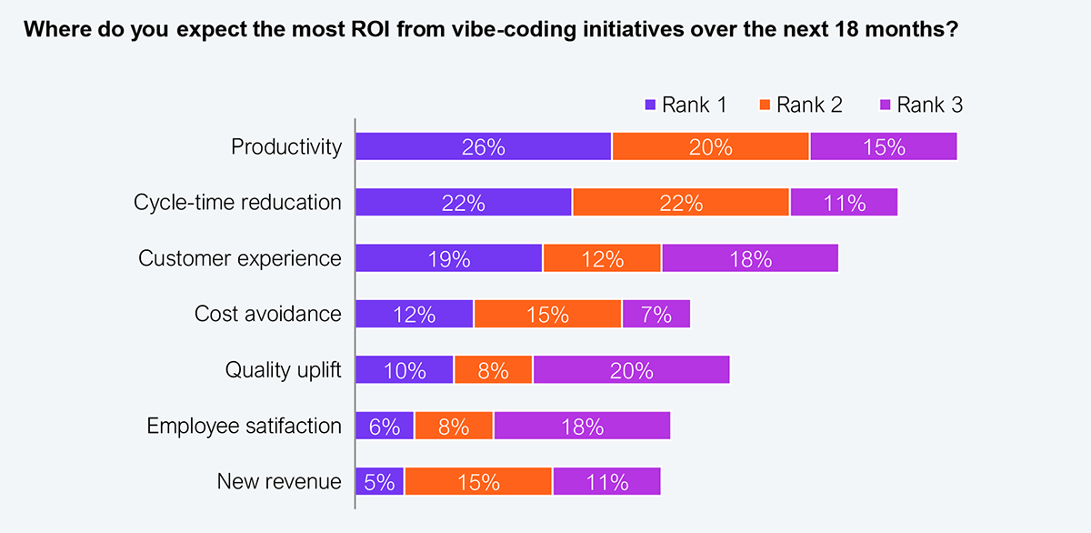This matters as many enterprises direct their AI investments into doing the same work faster to increase productivity. Even with the latest AI-led innovations such as vibe coding (see Exhibit 1), our data shows that enterprise expectations for transformational growth (measured by new revenue) sit at the bottom of the heap.