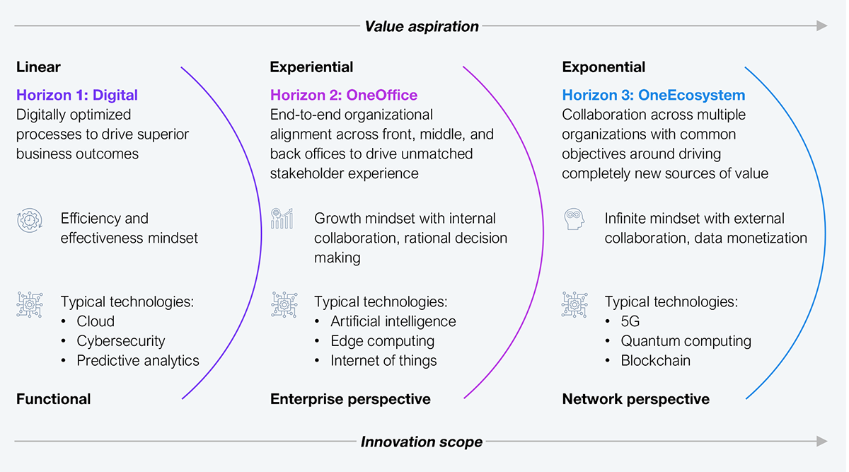 GCCs are on a growth trajectory in India. Twenty-four (24) of them surpassed the $1 billion export revenue mark in 2023–24, doubling in count in five years. For innovative GCCs to evolve beyond back offices contributing cost savings to also contribute revenue, their CIOs should adopt a OneOffice concept, breaking organizational barriers to focus on value creation. The three horizons in this GCC evolution, characterized by increasing levels of value creation and innovation, progress through Horizon 1, featuring digitally optimized processes for efficiency, and Horizon 2, with end-to-end organizational alignment for a OneOffice concept, then on to Horizon 3, which features collaboration across multiple organizations to achieve OneEcosystem (see Exhibit 1).