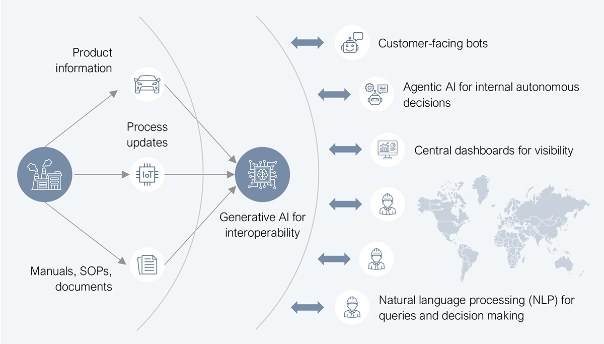 Existing and greenfield GCC leaders should include AI as a thread to break silos between the GCC and other teams and set up seamless collaboration, with no cultural, organizational, or technical barriers. Combinations of structured and unstructured data, along with insights from diverse sources in factories and plants, should be fed into large language models (LLMs) for enhanced interoperability (see Exhibit 2). The LLM serves as a sounding board, bringing together multiple teams across geographies, functions, and time zones to enable them to work coherently, regardless of language or area of interest. Hallucinations can be costly in the industrial world, and they must be avoided by validation and verification, with a human in the loop, and with ongoing feedback and fine-tuning of the model.