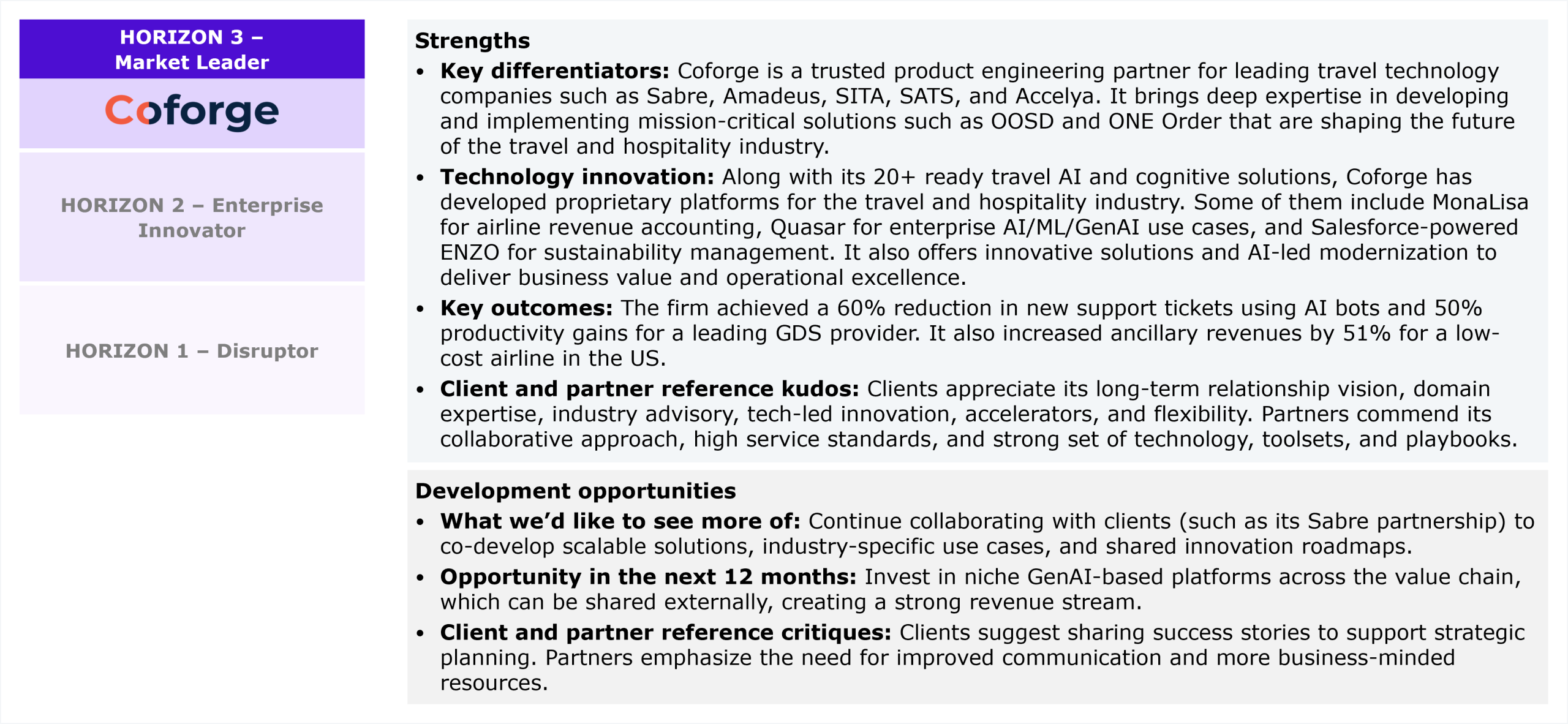Coforge’s performance in the study and HFS’ views of its strengths and development opportunities for services capabilities for travel and hospitality ecosystem