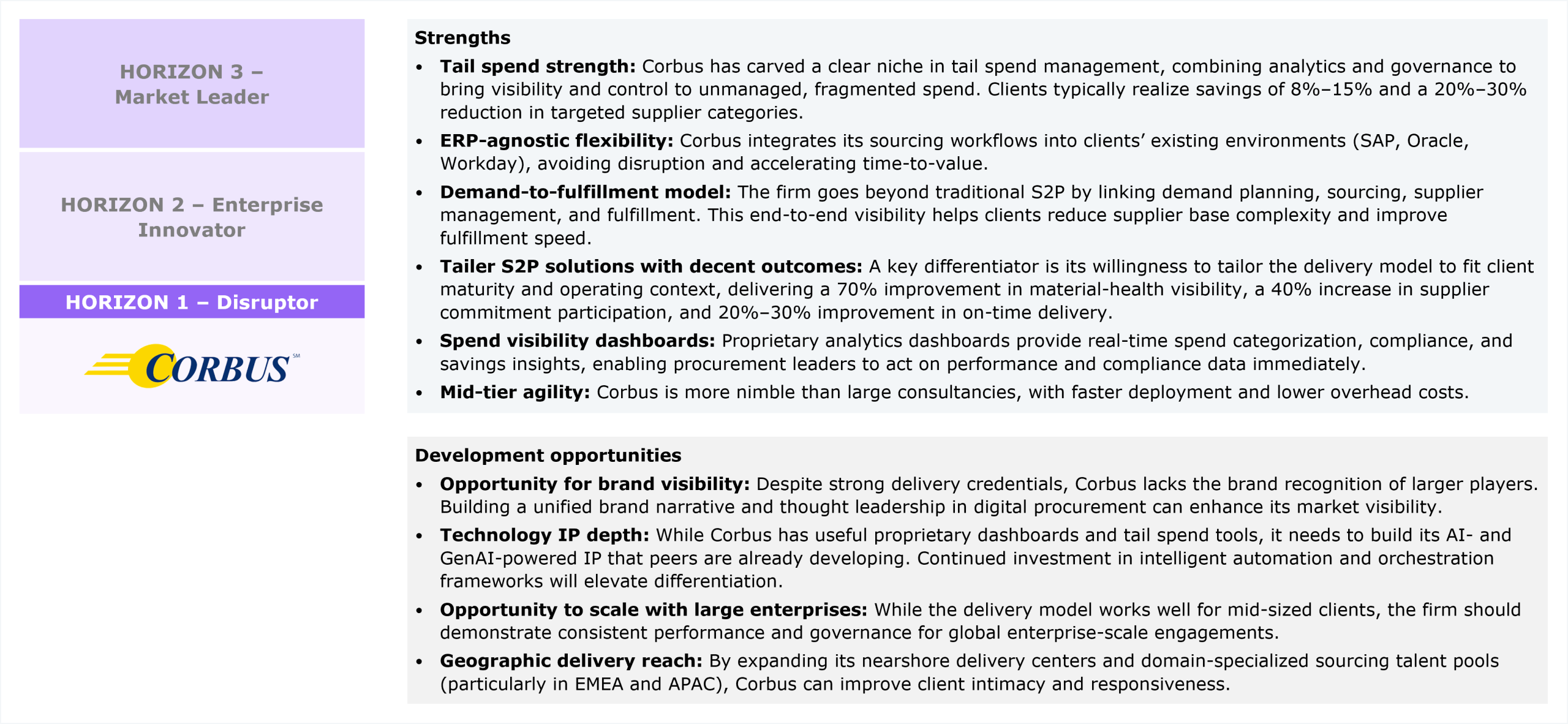 Corbus’ performance in the study and HFS’ views of its strengths and development opportunities for sourcing and procurement service capabilities