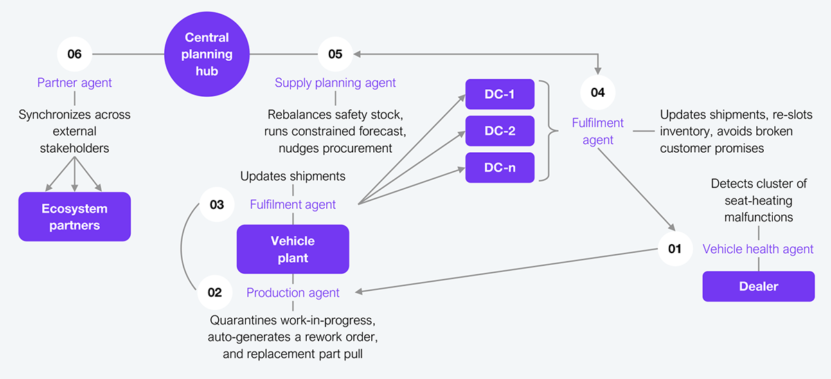 - A supply-planning agent readjusts short term demand and safety stock, rolls the impact into a constrained forecast, and nudges procurement.