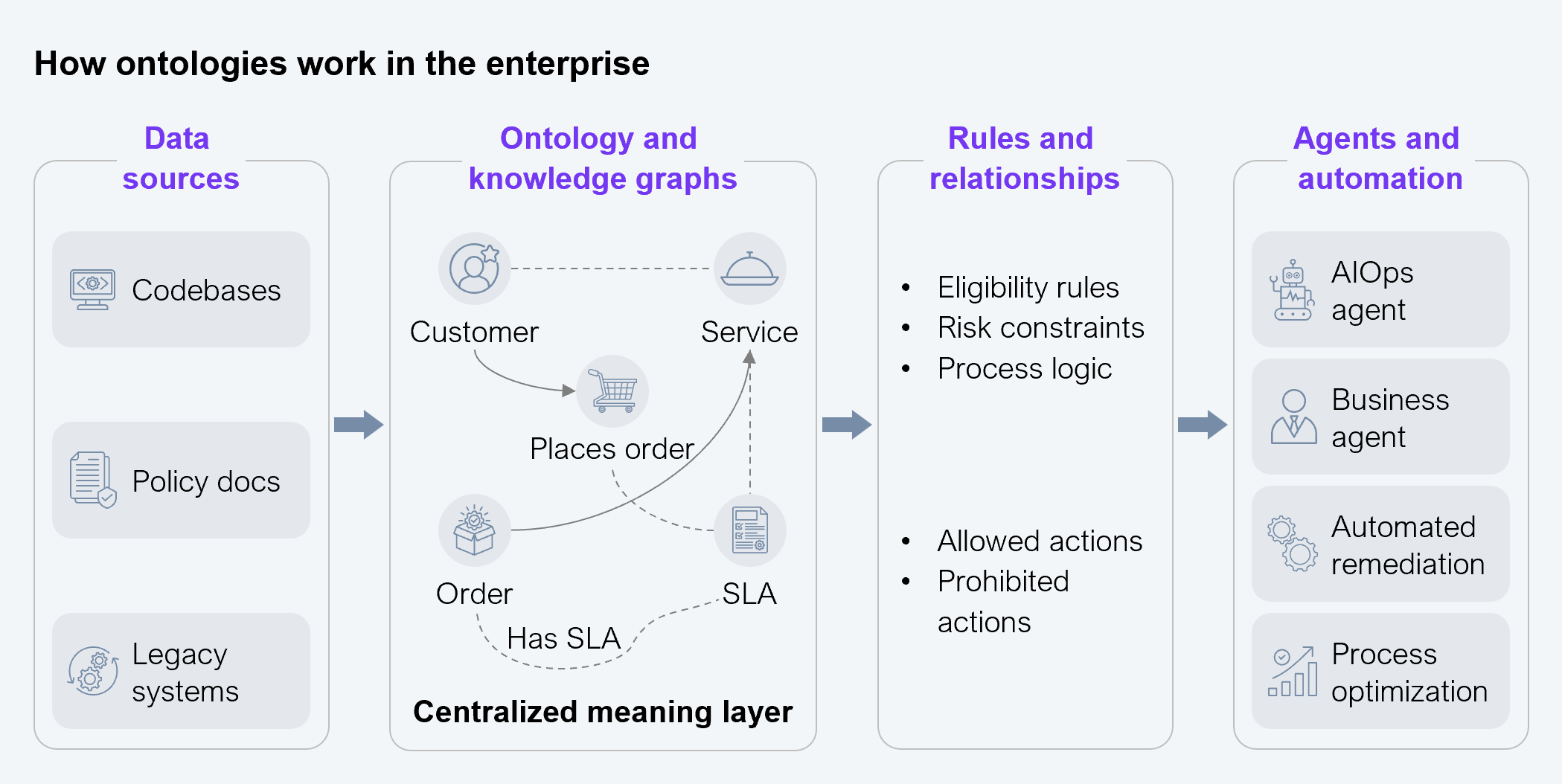 Such modeling brings together the code paths, exceptions, runbooks, policies, and tribal knowledge held in scattered artifacts across an organization. Without an effective ontology, every attempt at modernization, migration, or automation gets delayed or derailed while engineers spend time interpreting the meaning of systems and processes and the intentions behind them instead of improving them.