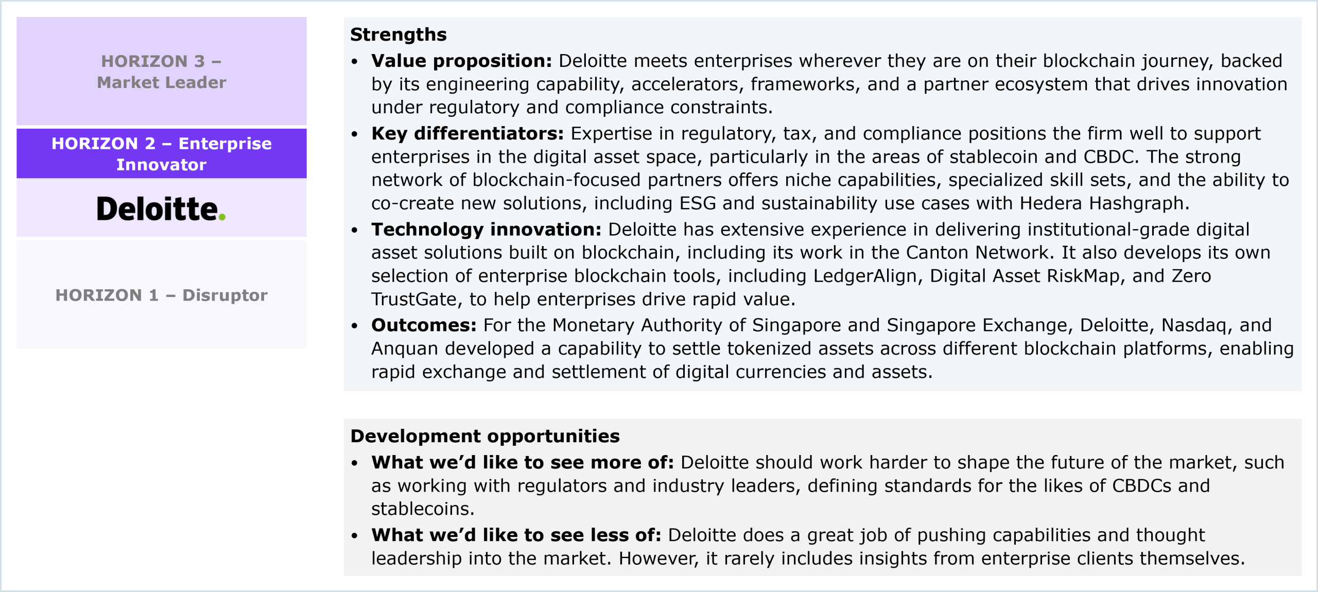 Deloitte’s performance in the study and HFS’ views of its strengths and development opportunities for enterprise blockchain service capabilities