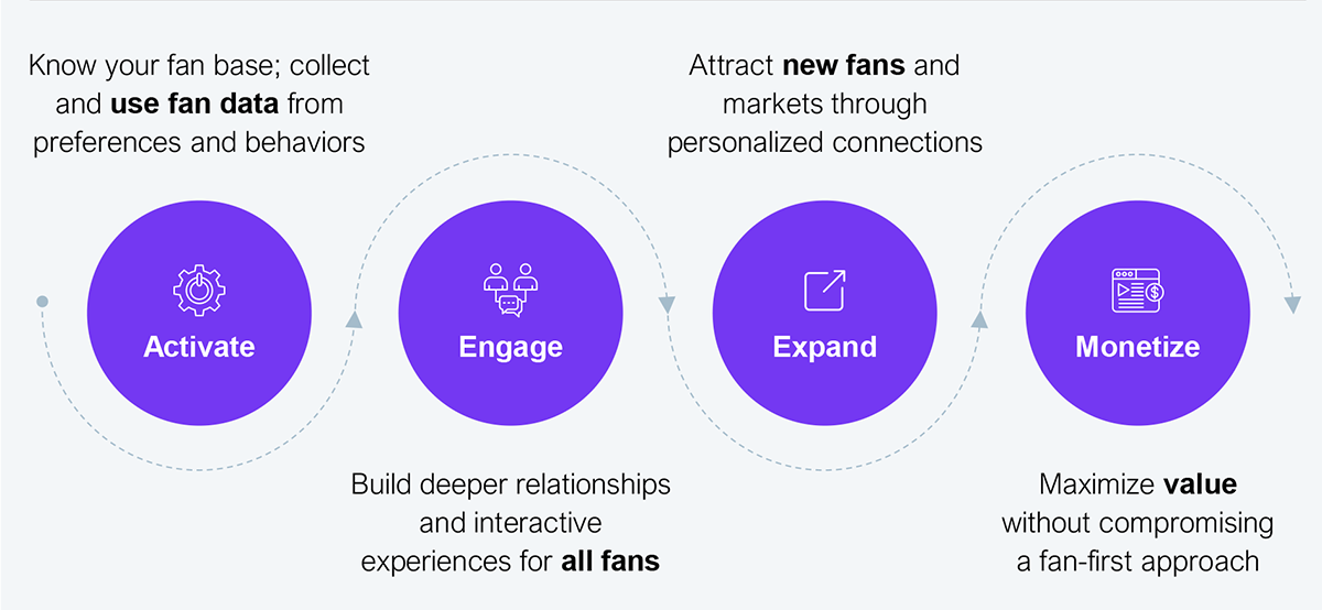 One of the biggest opportunities to elevate the fan experience emerges during live events. As fan expectations for immersive, personalized, and enjoyable moments continue to rise, stadiums have a tremendous chance to evolve and meet those ambitions. As technology is baked into sports, CIOs are uniquely positioned to reimagine how fans connect with the team, spark deeper passion, and enrich every moment they spend in the venue. Based on discussions with numerous organizations, Exhibit 2 outlines the four pillars that define a best-in-class fan experience.