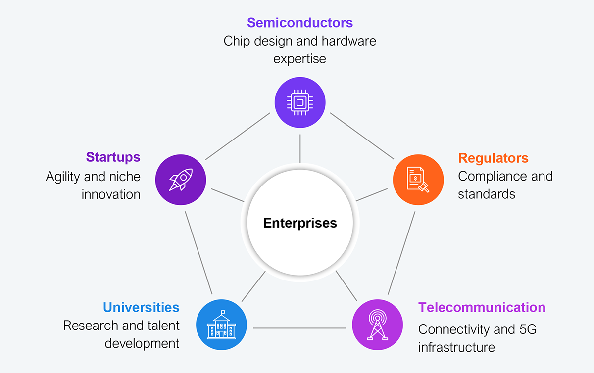 Co-creation labs, strategic partnerships, and joint ventures with semiconductor companies, telecom vendors, universities, and even startups create an environment where risks can be mitigated, proof-of-concepts (POCs) can be tested quickly, and solutions can scale more efficiently. For instance, a private 5G lab partnership ensures interoperability and compliance before large-scale rollouts, mitigating both financial and operational risks. By engaging ecosystems, enterprises don’t just get access to technology; they reduce cost burdens, increase agility, and ensure alignment with evolving standards and regulations.