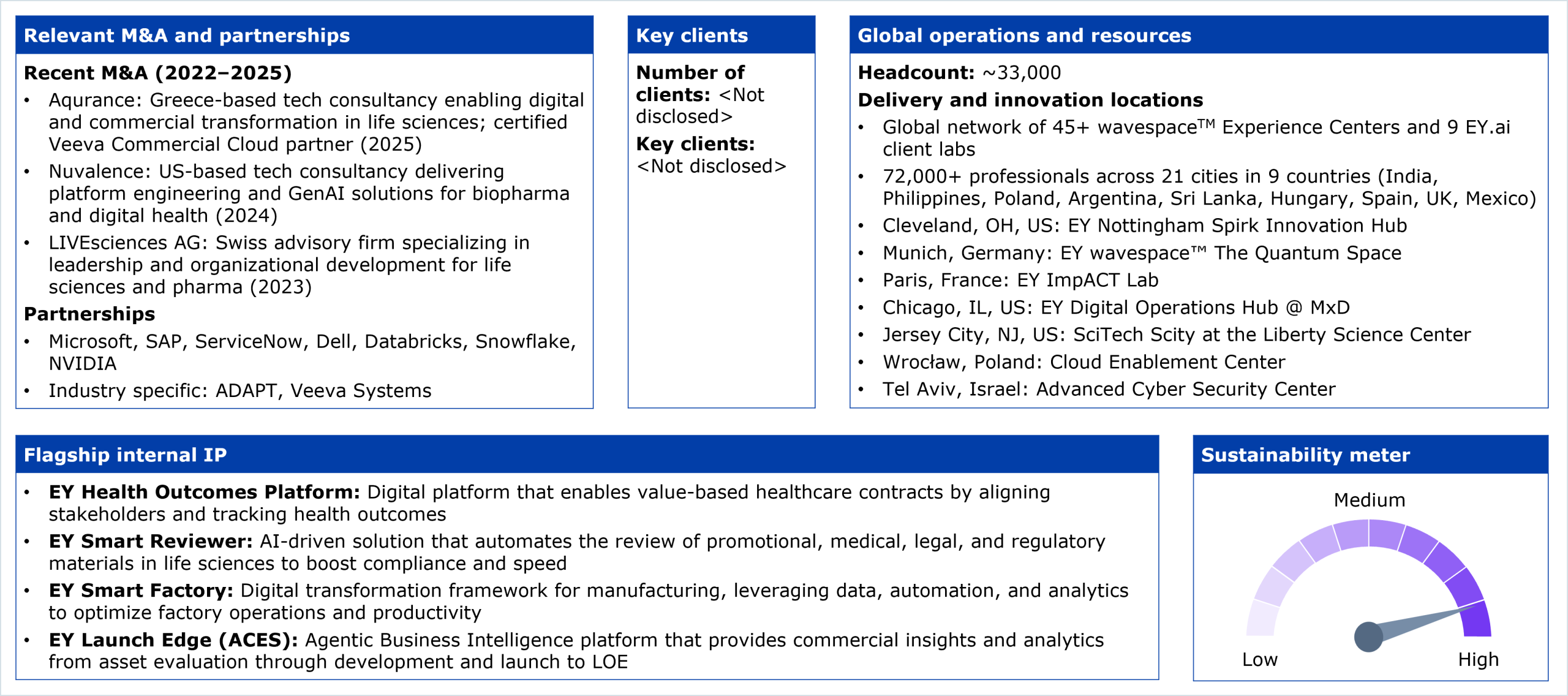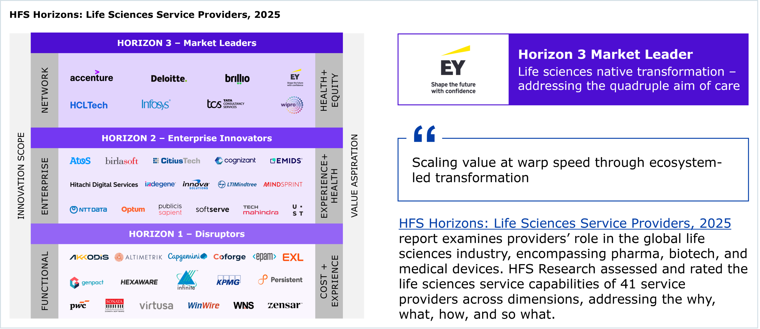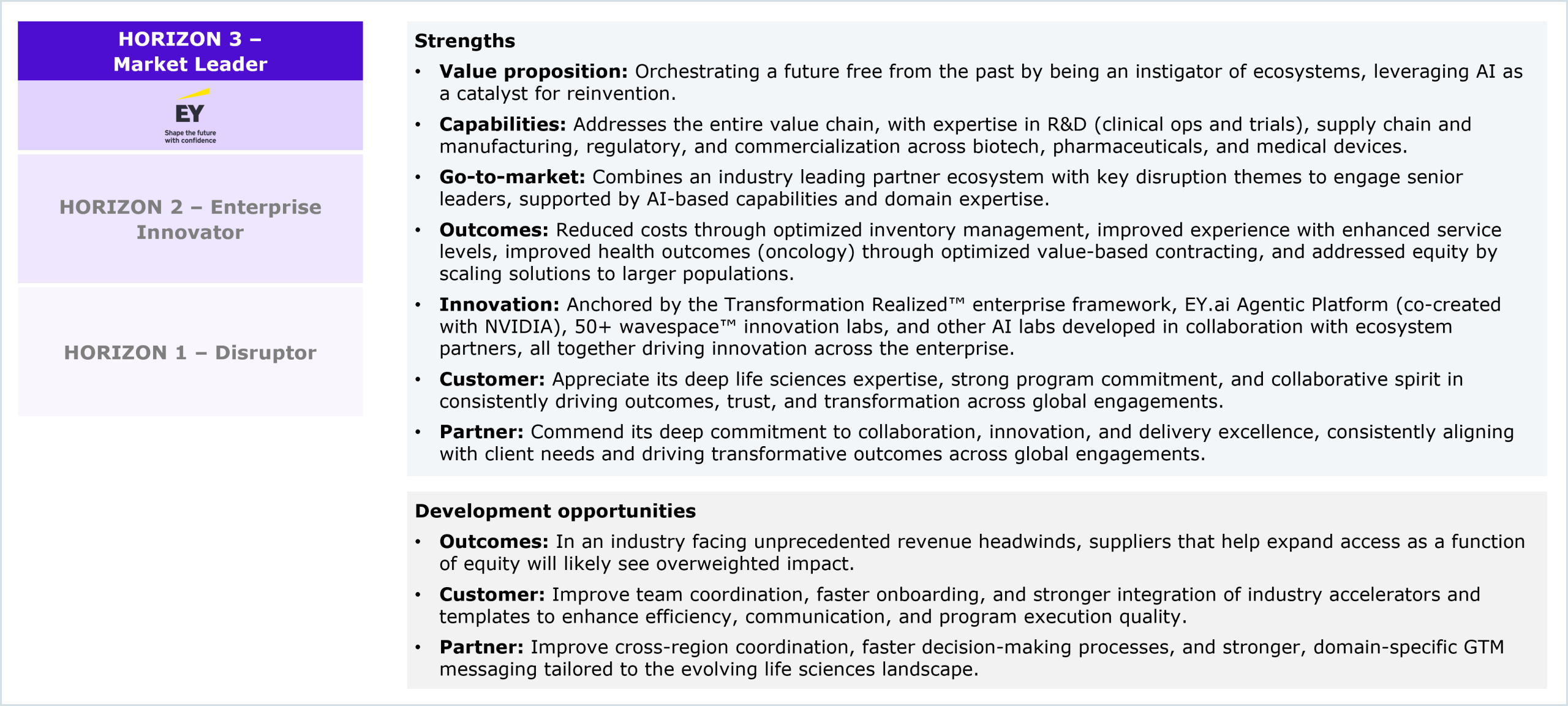 EY’s performance in the study and HFS’ views of its strengths and development opportunities for life sciences service capabilities