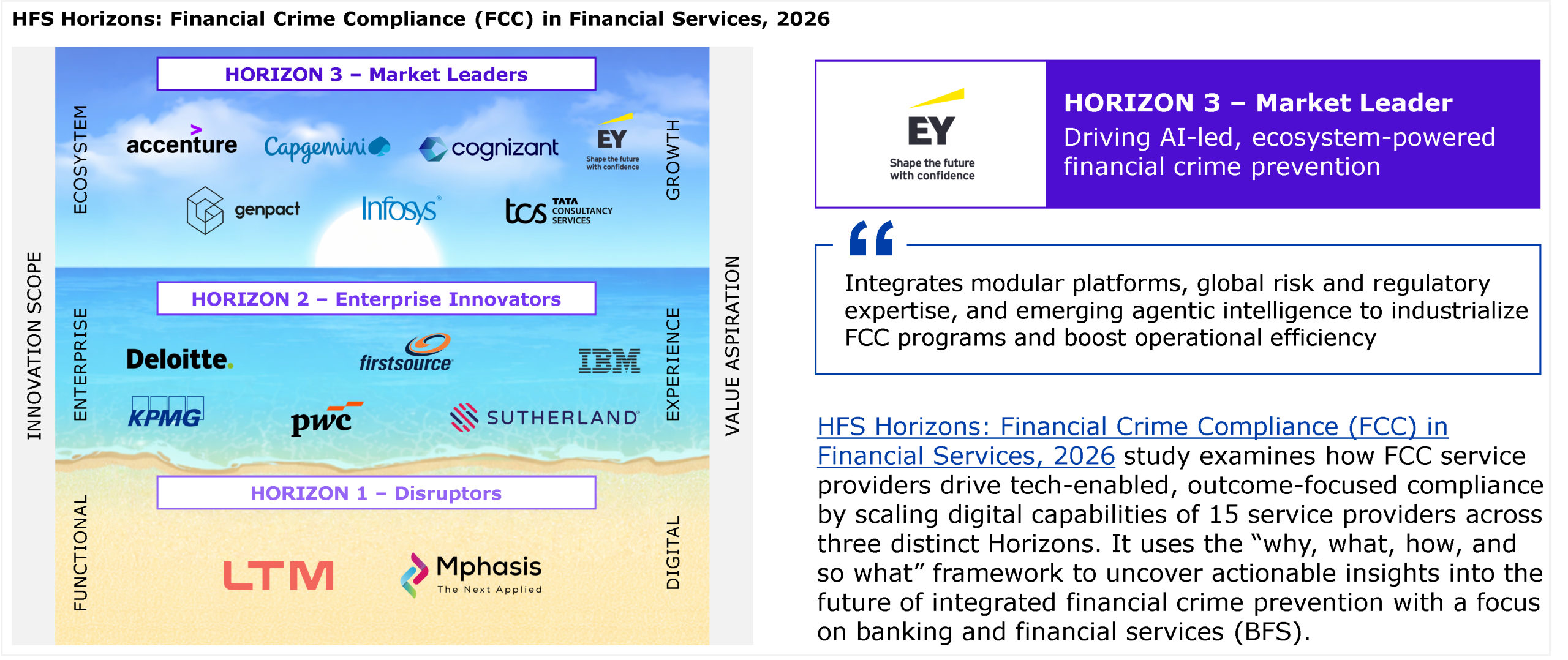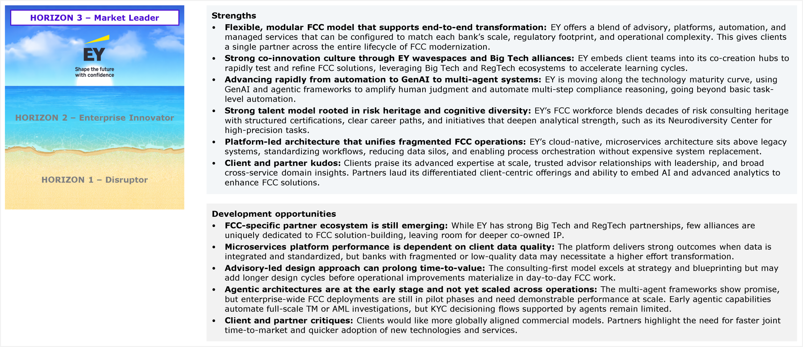 EY’s performance in the study and HFS’ views of its strengths and development opportunities for services capabilities for financial crime compliance (FCC) in financial services