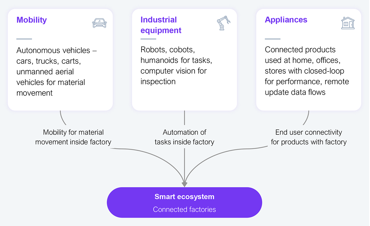 Physical AI applications broadly fall under four categories: (1) smart ecosystems, like an office or factory, (2) mobility devices such as driverless cars, trucks, and drones, (3) industrial equipment such as robots and cobots, and (4) home appliances (see Exhibit 2). A car is an example of a product moving from a factory to the garage and beyond, illustrating how these categories are interconnected across the life cycle.