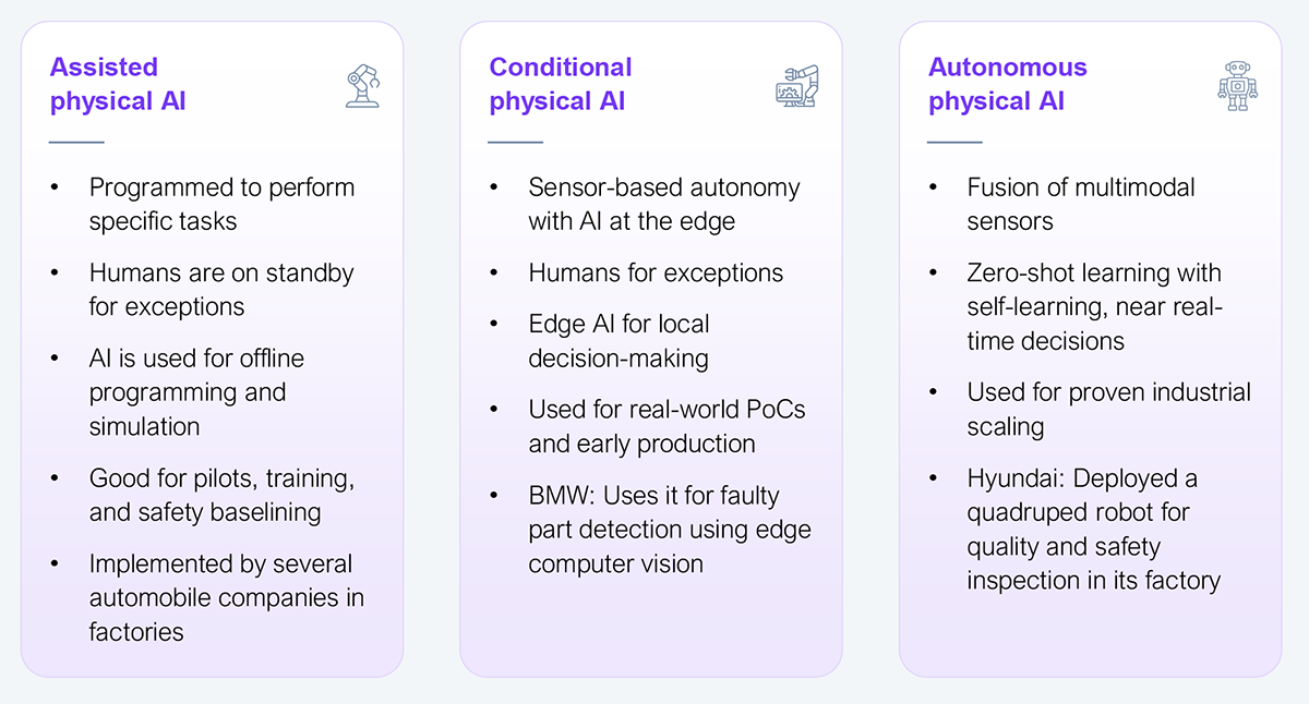 We define physical AI as software-led services embodied in physical systems (robots, humanoids, vehicles, industrial equipment) that perceive, decide, and act with interoperability in the real world, operating autonomously, and delivered and monetized as productized services. With the aging demographics, geopolitical issues, and strained human talent mobility across countries, physical AI emerges as a timely and strategic solution. Manufacturers must choose the appropriate level of physical AI—assisted, conditional, or fully autonomous systems—based on their maturity in AI adoption, business needs, and appetite for investment (see Exhibit 1).