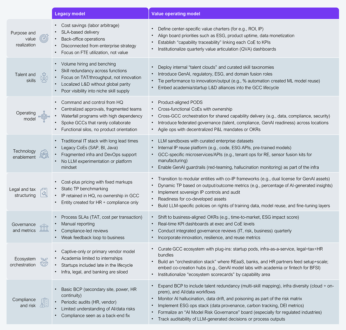 The Bottom Line: Enterprise leaders must stop measuring GCCs by cost and start measuring them by what they create. That means hardwiring alignment with business outcomes, co-developing IP frameworks, embedding GenAI risk management, and establishing reuse as defaults.