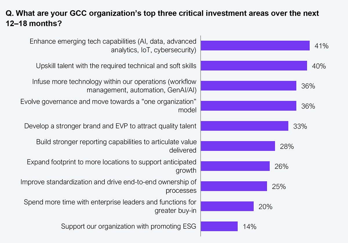 But the window to get this right is closing fast. GCCs must now become hubs for capability reuse and digital scale, or risk becoming irrelevant in the enterprise transformation story. Over 40% of the GCC leaders we surveyed have already prioritized AI, data, and cybersecurity as their top investment areas over the next 12–18 months (see Exhibit 1), signaling a clear shift from capacity to capability. These centers are not just supporting back-office tasks; they’re now core to innovation pipelines, regulatory compliance, and digital operating models.