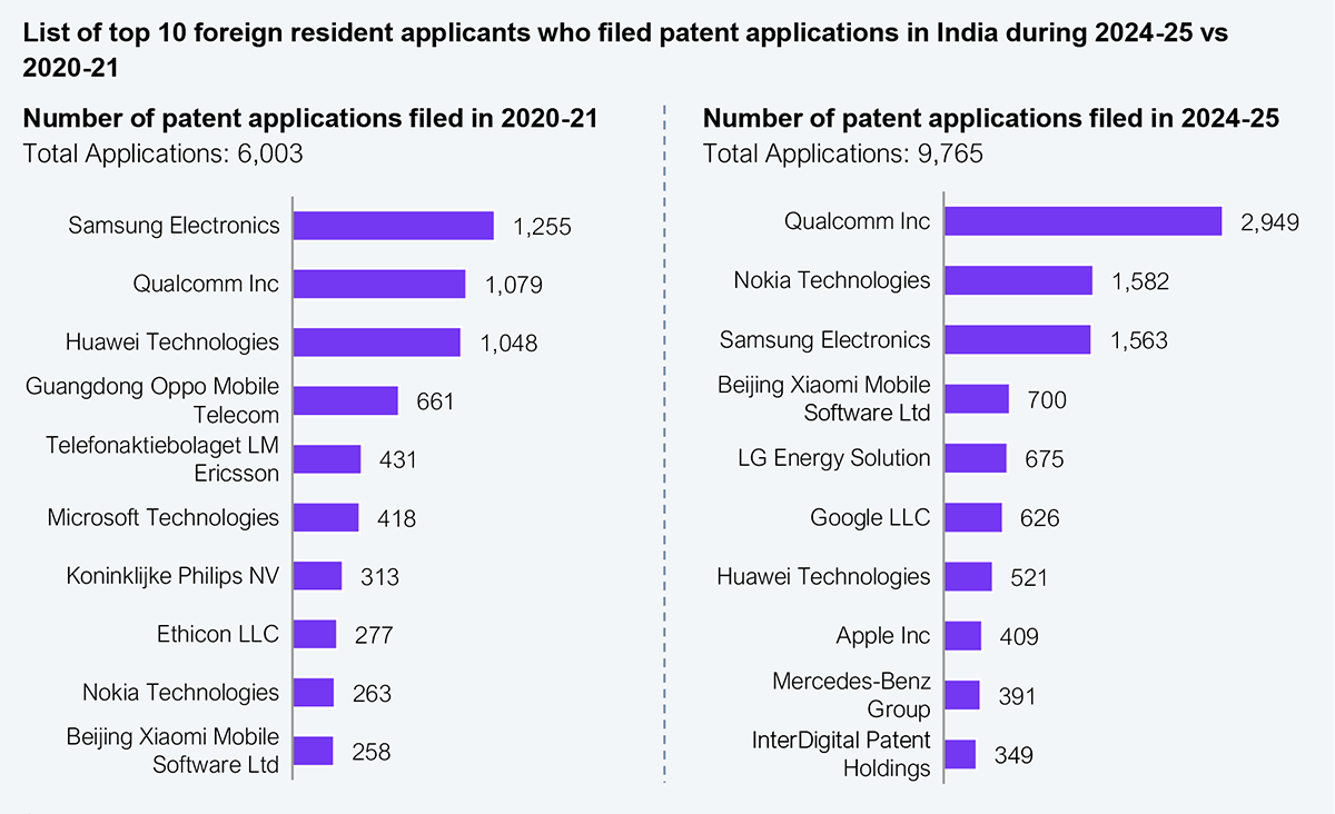 Our research showed that the top 10 foreign resident applicants in India, including Qualcomm, Nokia, Samsung, and Google, filed over 9,765 patent applications in 2025. This represents a 60% increase (from 6,003) from 2021, highlighting their ability to innovate and differentiate themselves globally. Qualcomm leads in patent applications and grants, with most filings coming from mobile and ancillary manufacturers. Google, Apple, and Mercedes-Benz recently started filing patent applications in the country, pointing to their inclination to further expand their core products and offerings.