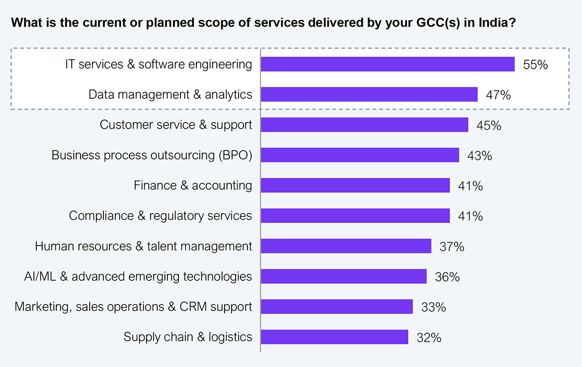 Our recent Pulse survey supports this: more than 204 GCC leaders revealed that about 55% planned to deliver IT and software engineering services, followed by data management and analytics (see Exhibit 1). This shows the mission-criticality of both software services and clean core data for executing software-defined engineering solutions.