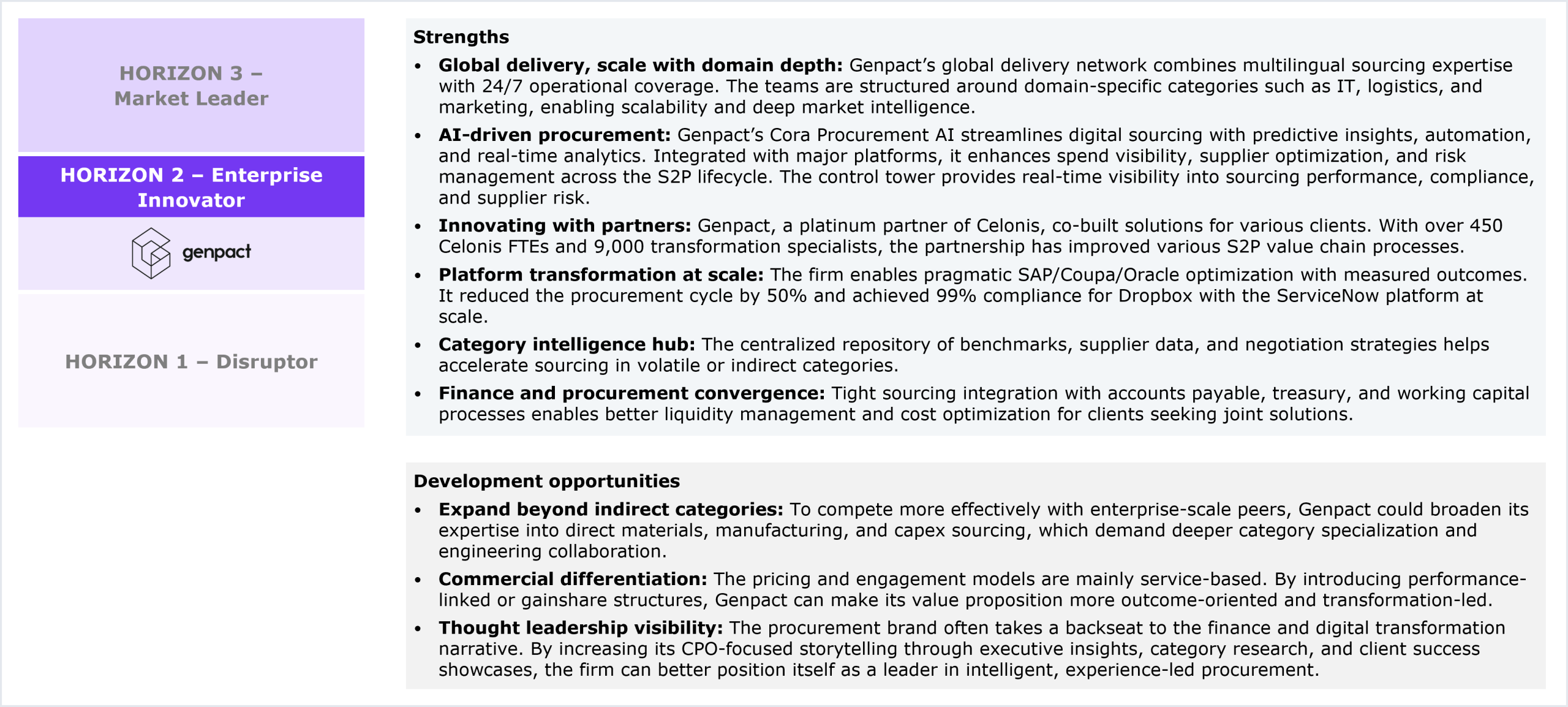 Genpact’s performance in the study and HFS’ views of its strengths and development opportunities for sourcing and procurement service capabilities