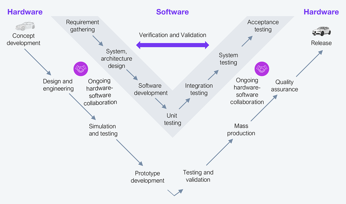 Moreover, modern car development is bimodal in nature—hardware and software are developed at different speeds, making it difficult to synchronize their lifecycles. Hardware typically follows a waterfall model with linear gated checkpoints for quality assurance, while software is iterative and agile. To bridge that gap, carmakers should implement the V-shaped model (see Exhibit 1) that Automotive SPICE (ASPICE; an industry-standard guideline for software development) advocates.