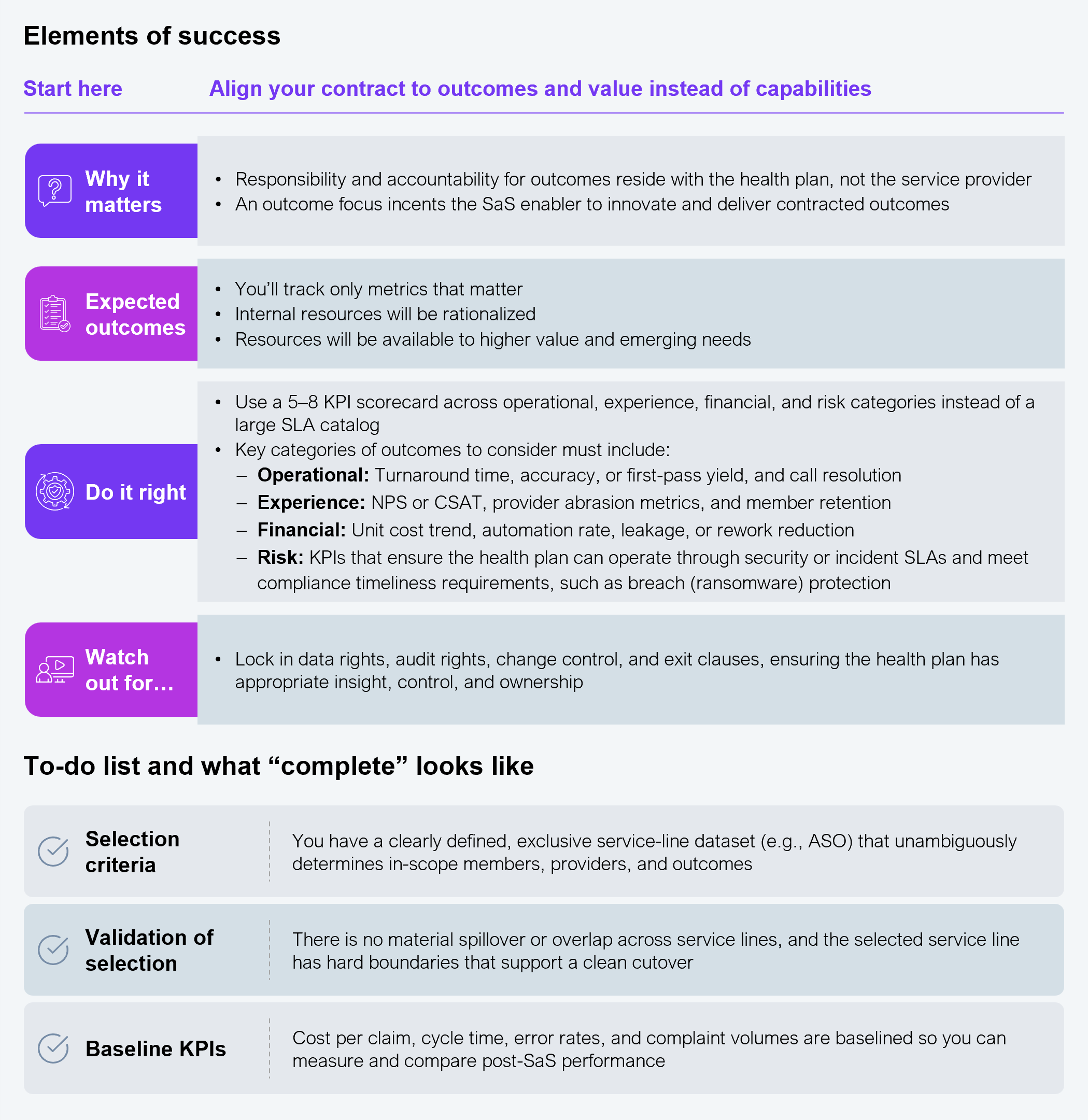 SaS (see Exhibit 1) will enable the move away from people-based delivery to IP-led delivery (AI-enabled risk stratification model), from capability or process outsourcing to outcomes orchestration (low provider call volume), and, crucially, from static annual agreements to contract-based, telemetry-driven value realization (prior auth leakage reduction measured by fewer avoidable calls, faster approvals, lower abrasion). The operational approach in this playbook should yield 5% to 10% in operational cost savings while maintaining compliance and risk posture, depending on the types of outcomes.