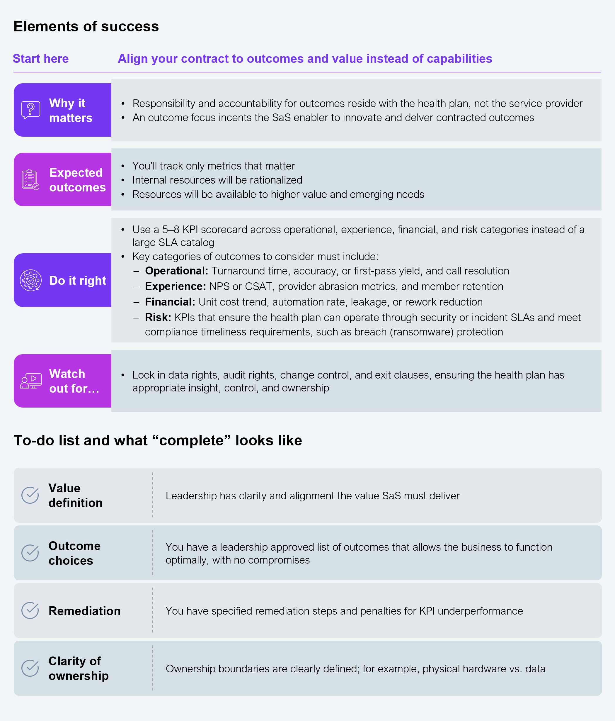 A health plan is responsible to regulators and customers. Consequently, contract outcomes must include a control set for audit rights, data ownership, incident SLAs, regulatory reporting responsibilities, and service credits tied to measurable KPIs.