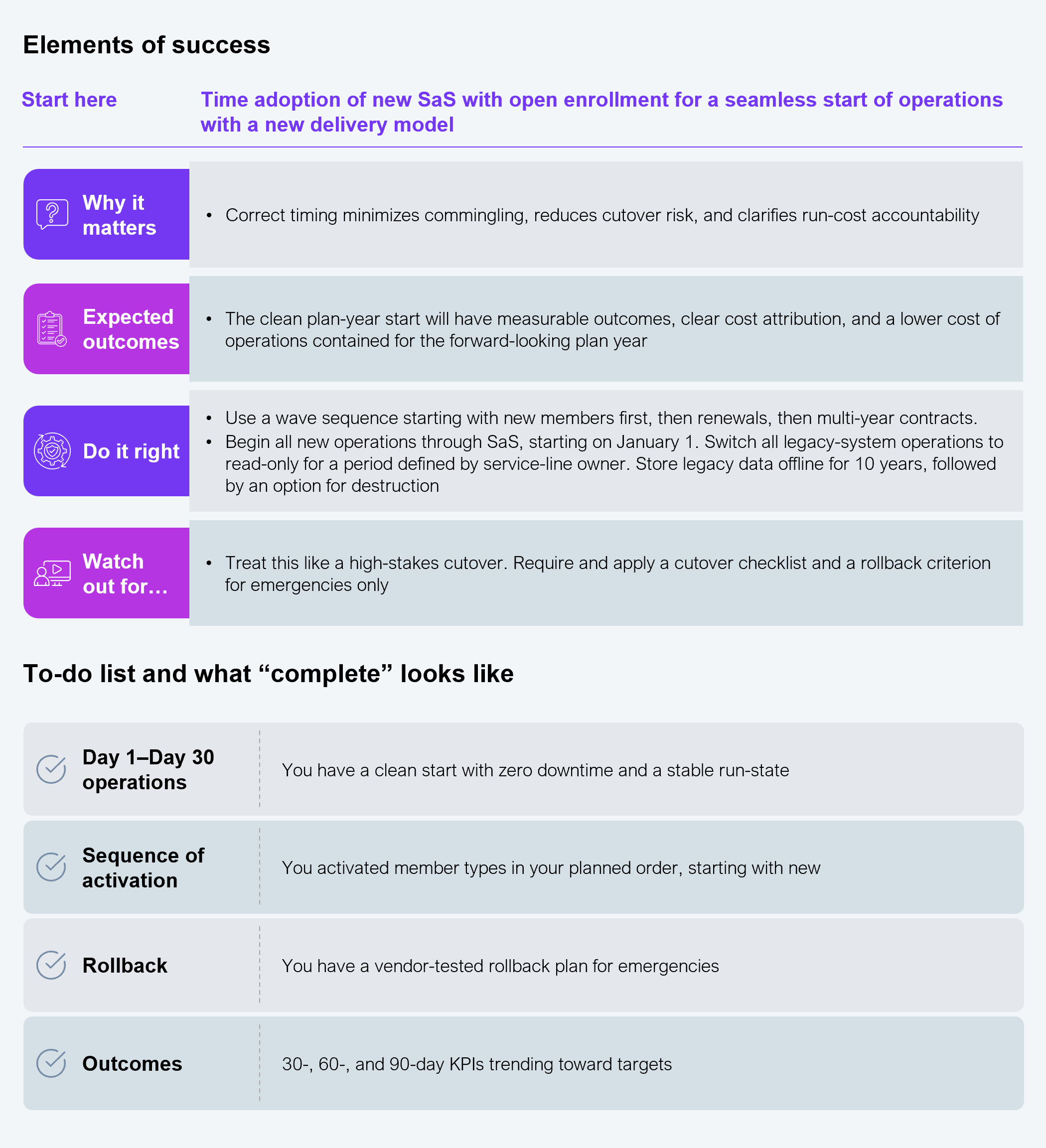 Health plan CIOs must avoid analysis paralysis by adopting the least-resistant path from start to finish (see Exhibit 3) to be ready for open enrollment and the beginning of the plan year.