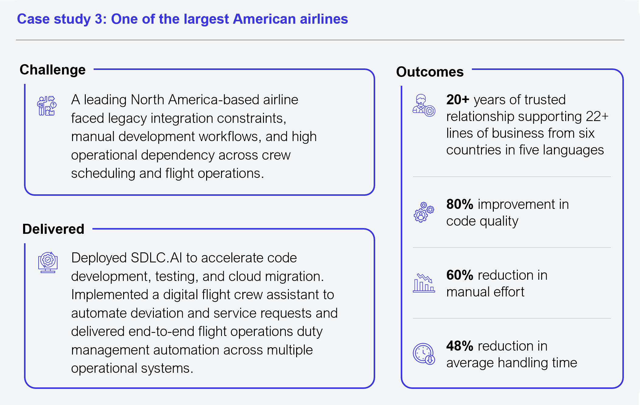 • Seamless mishandled baggage resolution: Baggage.AI converts a high-friction airline process into an automated workflow. It integrates with core airline systems for tracking, alerts, and claims management. This is a clear example of IGT transforming domain depth into reusable CX IP.