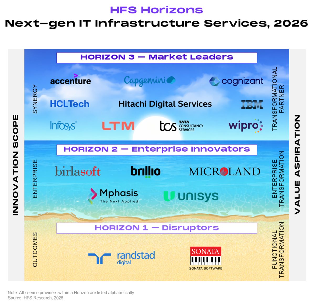 The “HFS Horizons: Next-gen IT Infrastructure Service Providers, 2026” report evaluates 17 service providers on their ability to help enterprises reimagine infrastructure for AI-native operations and distributed digital environments. It assesses providers’ capabilities and outcomes across the HFS next-gen infrastructure services value chain to understand the why, what, how, and so what of their offerings.