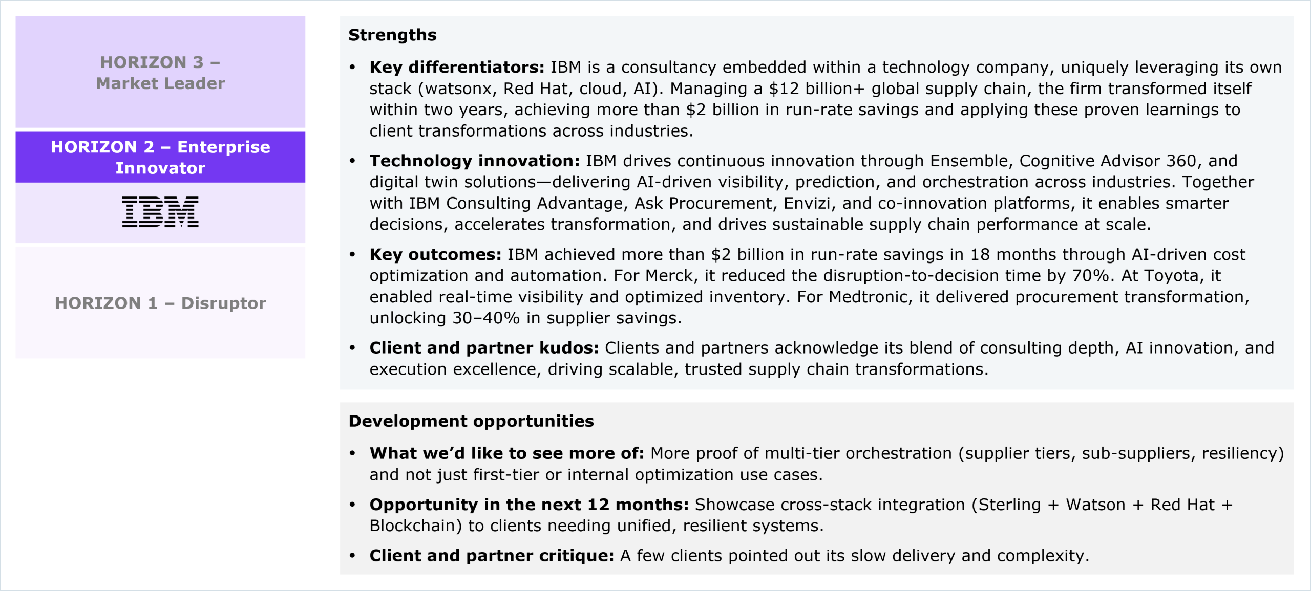 IBM’s strengths and development opportunities, as per HFS’ analysis, in intelligent supply chain services capabilities
