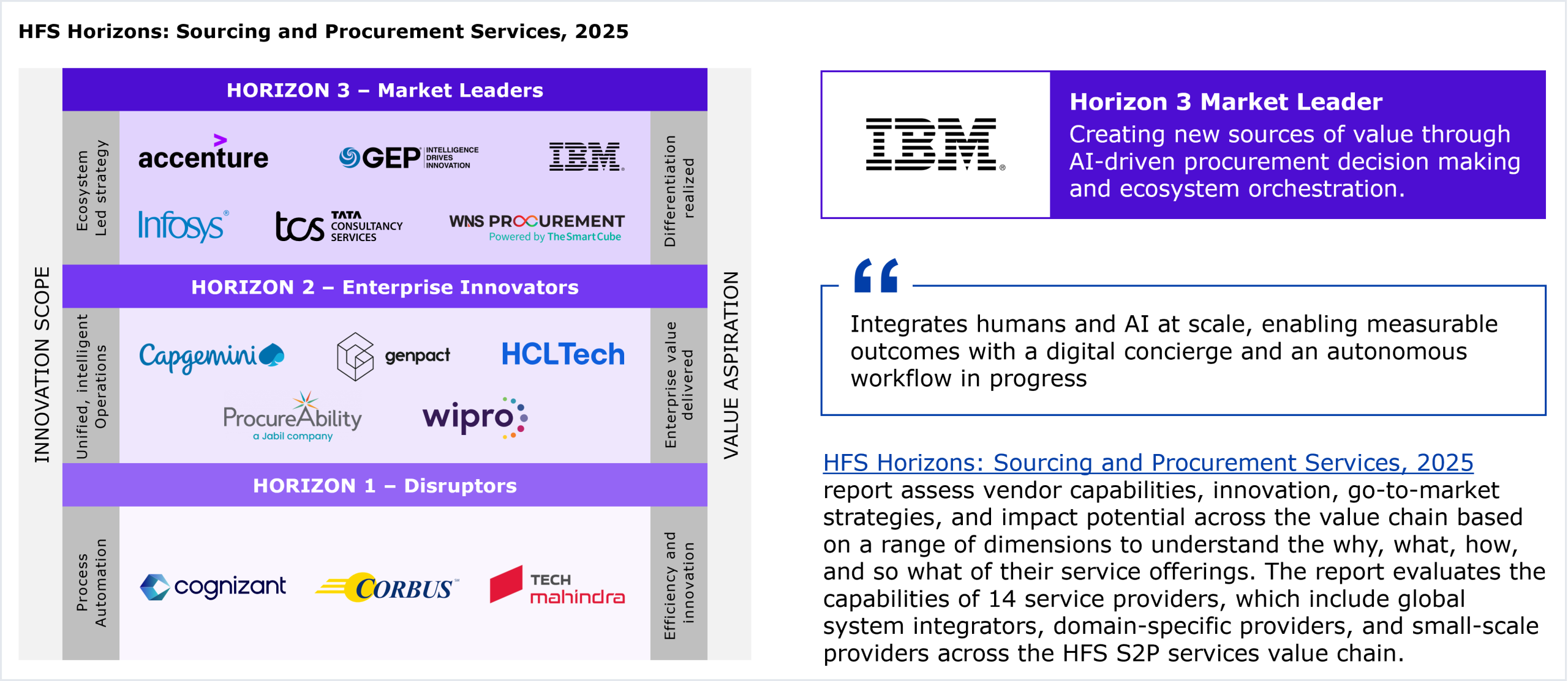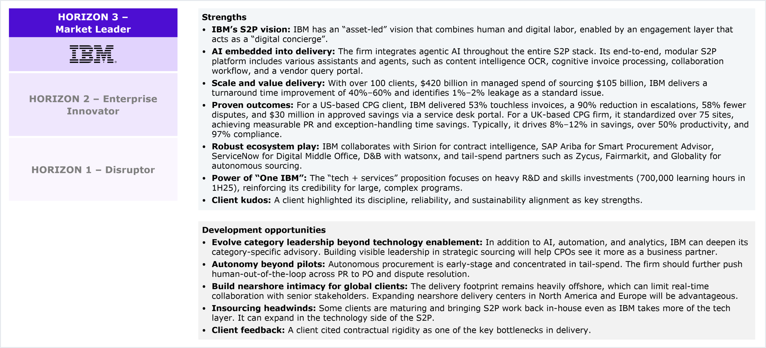 IBM’s performance in the study and HFS’ views of its strengths and development opportunities for sourcing and procurement service capabilities
