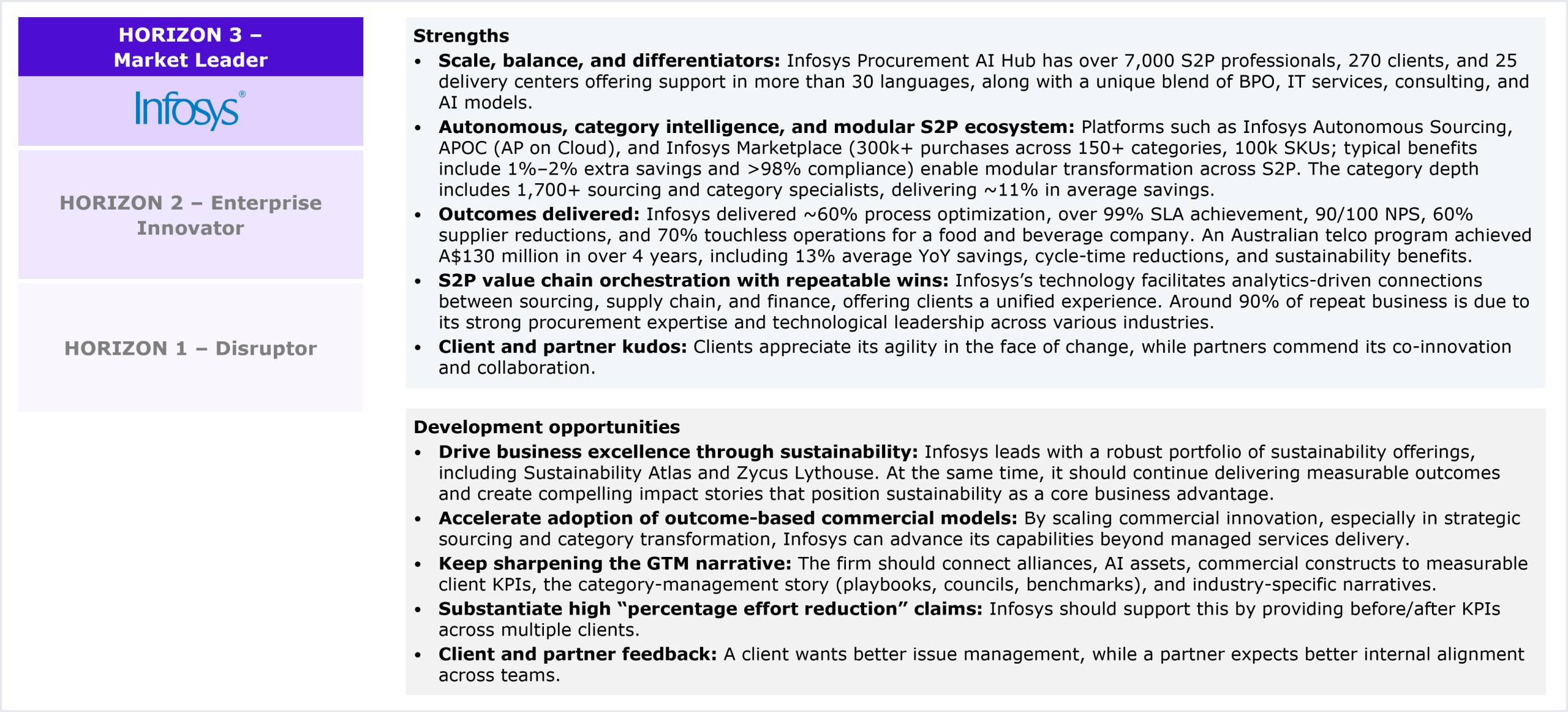 Infosys’ performance in the study and HFS’ views of its strengths and development opportunities for sourcing and procurement service capabilities