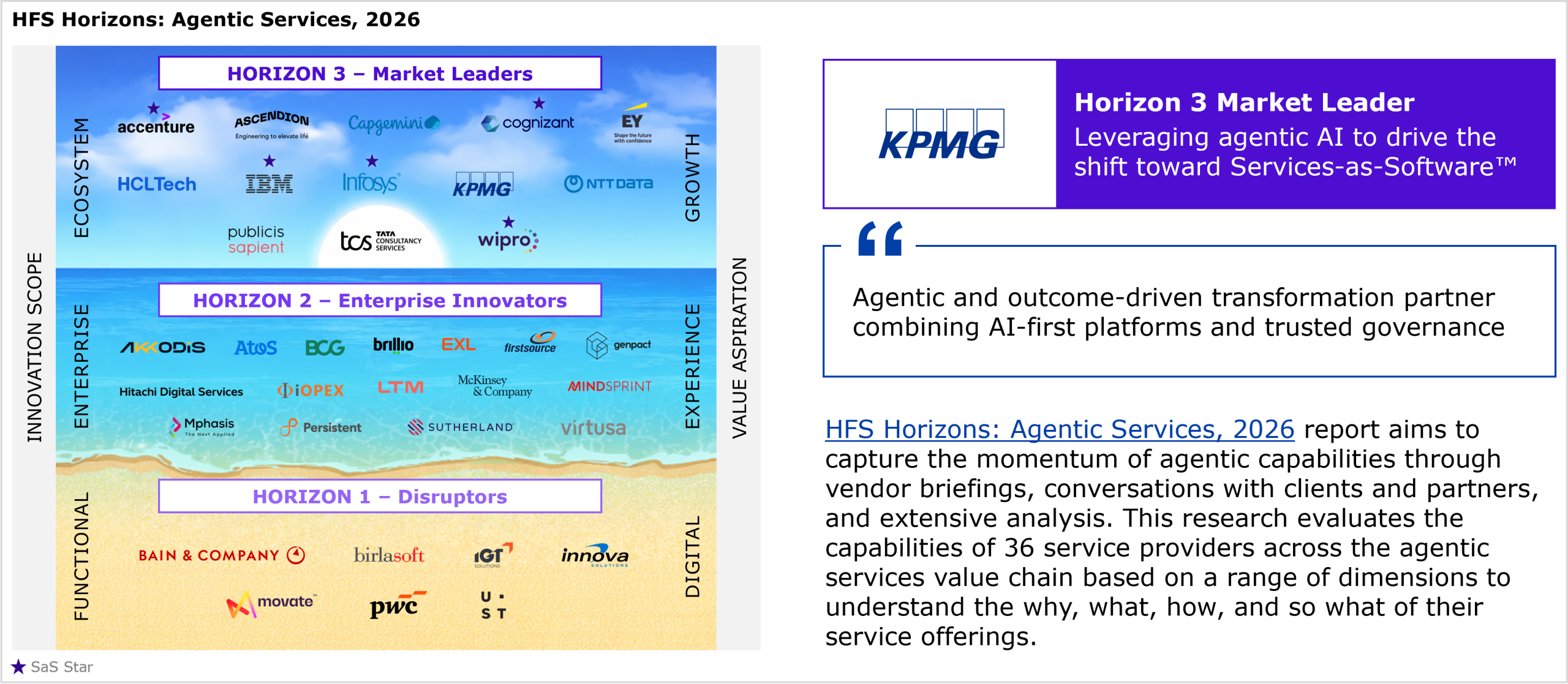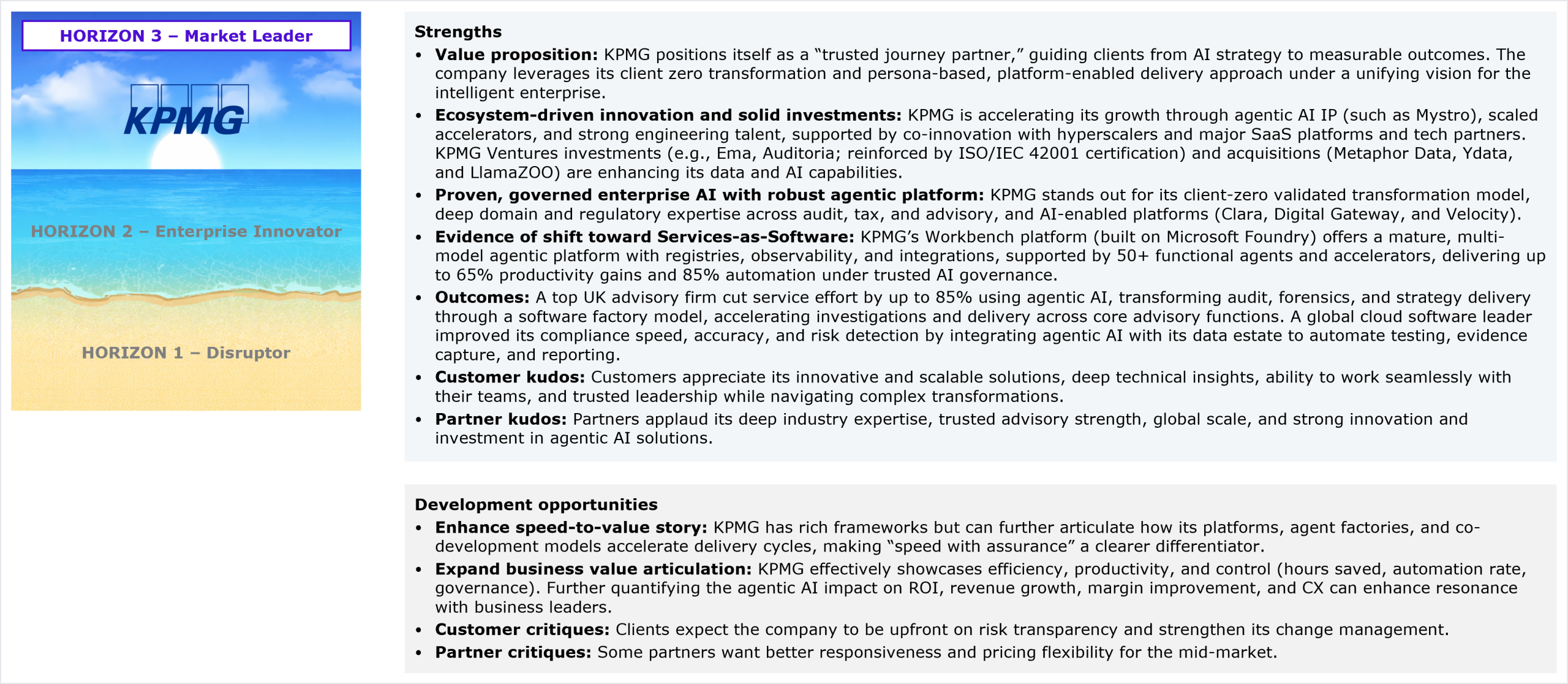 KPMG’s performance in the study and HFS’ views of its strengths and development opportunities for agentic services capabilities