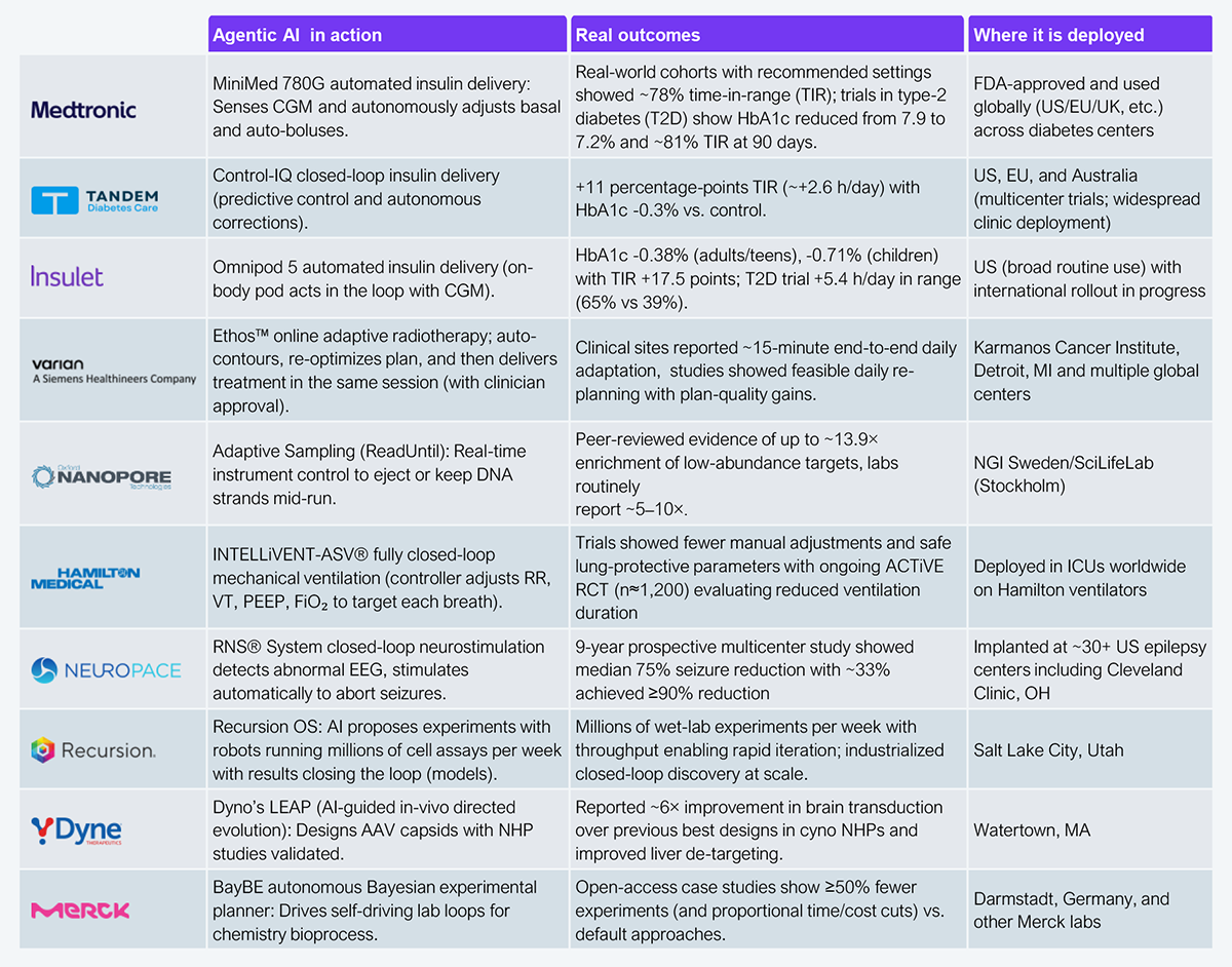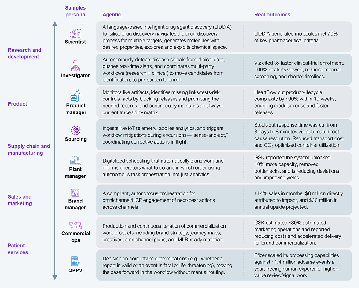 Life sciences enterprises remain cagey about how, where, and when they deploy agentic AI, given that it is becoming their ultimate market differentiator. However, there is increasing evidence that it is being used at scale across the value chain (see Exhibit 2). Medical device companies are leading the charge with consumer-facing devices that leverage agentic AI and are gaining public trust and acceptance. Biopharma and biotech are also leveraging them, but they are mainly in stealth mode now. Notably, there is increasing evidence that regulators support agentic AI, which must be considered a tailwind for enterprises sitting on the fence.