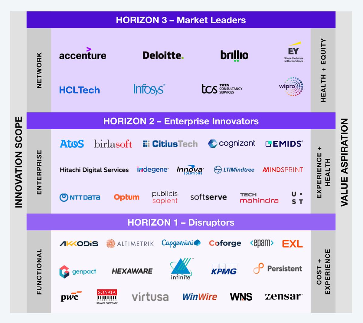 The HFS Horizons: Life Sciences Service Providers, 2025 study evaluated 41 service providers (see Exhibit 1) on their ability to address the quadruple aim of care (cost, experience, health outcomes, and health equity). Horizon 1 providers predominantly demonstrate evidence on bending the cost curve and enhancing the care experience. Horizon 2 providers delivered improved health outcomes in addition to impacting cost and experience. Horizon 3 providers impacted all attributes of the quadruple aim of care.