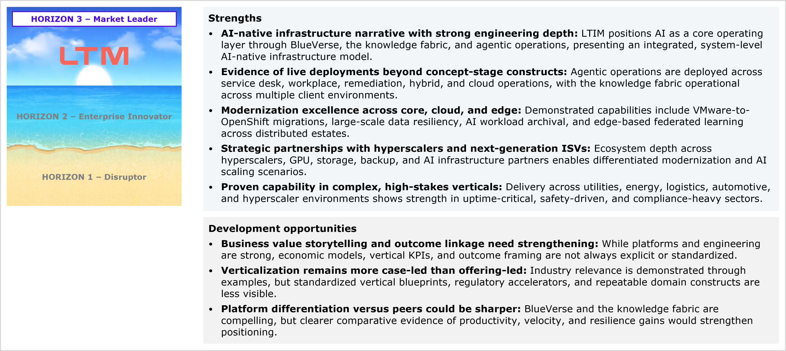 LTM’s performance in the study and HFS’ views of its strengths and development opportunities for next-gen IT infrastructure services capabilities