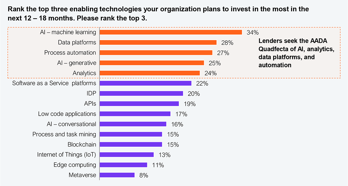 Frontier technologies are reshaping mortgage operations, from streamlining origination to extending deeper into the lending lifecycle, particularly servicing, which remains a whitespace ripe for disruption. These technologies align with the HFS AADA Quadfecta—analytics, artificial intelligence (AI) (machine learning and generative AI), data platforms, and automation—as illustrated in Exhibit 4. When implemented effectively to optimize the most promising parts of the value chain, this cohort of technologies can improve efficiency, reduce costs, raise loan quality, and expand product offerings through data-driven decision-making, delivering a significantly enhanced borrower experience. While automation remains the golden lever, technologies such as intelligent document processing (IDP) and optical character recognition (OCR) are commonly used across mortgage operations, bridging the analog–digital divide.