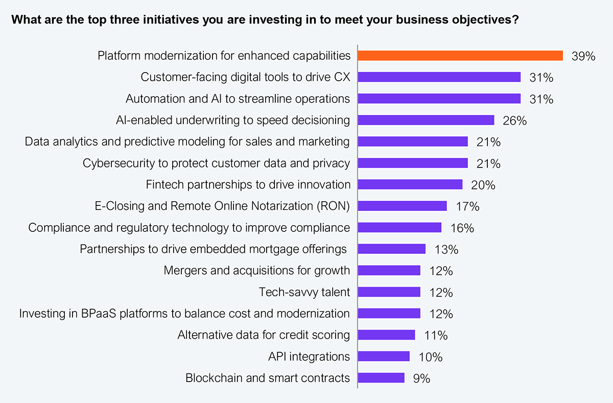 Platform modernization has become the top strategic investment priority for lenders (see Exhibit 3), alongside digital transformation, automation, and AI. Shedding legacy systems injects agility into mortgage operations, shifting them from fragmented, labor-intensive workflows to digitally and data-driven business models. Modernization also strengthens integration with internal systems and deepens connections across the external ecosystem, leveraging technologies such as automation and AI. In a fiercely competitive and price-sensitive market where borrowers routinely switch for better rates and, more importantly, a superior experience, modernization is no longer optional.
