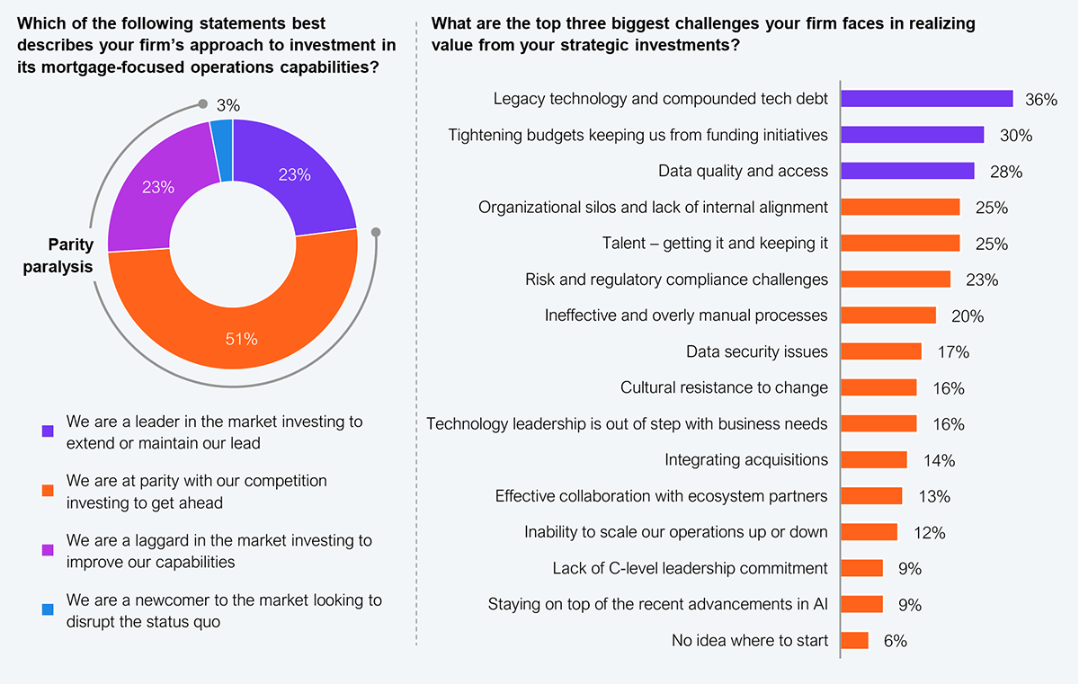 The mortgage industry has been feasting on a smorgasbord of external and internal pressures, and lenders must be ready to ride out the odds. By Q3 2023, origination costs had surged to $11,600 per loan, according to Freddie Mac, and servicing remains a low-margin grind, offering little relief. Add the internal drag of legacy technology, tightening budgets, and fragmented data, and most lenders remain stuck in a sea of sameness, unable to break out as leaders, as shown in Exhibit 2.