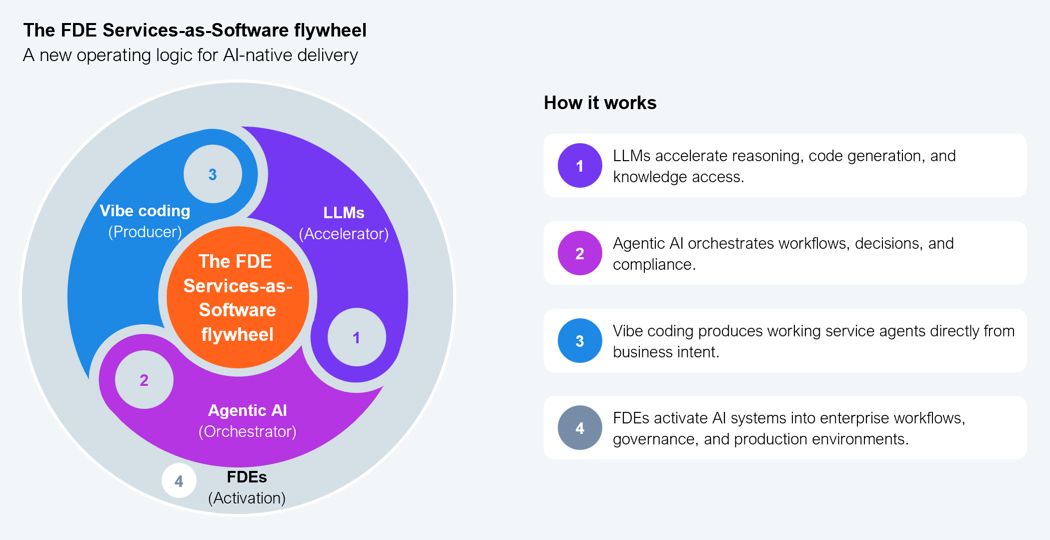 The partnership with Palantir, one of the five “commercial business partners” Palantir has committed to, delivers more than a brand halo of speed-to-outcome capability. It is at the core of Rackspace’s new operating model, emphasizing forward-deployed engineering (FDE; see Exhibit 1), the power and value of ontology in supporting AI that works in enterprise settings, proof-led selling to end the pilot purgatory trap, and rapid workflow redesign to get to outcomes fast.
