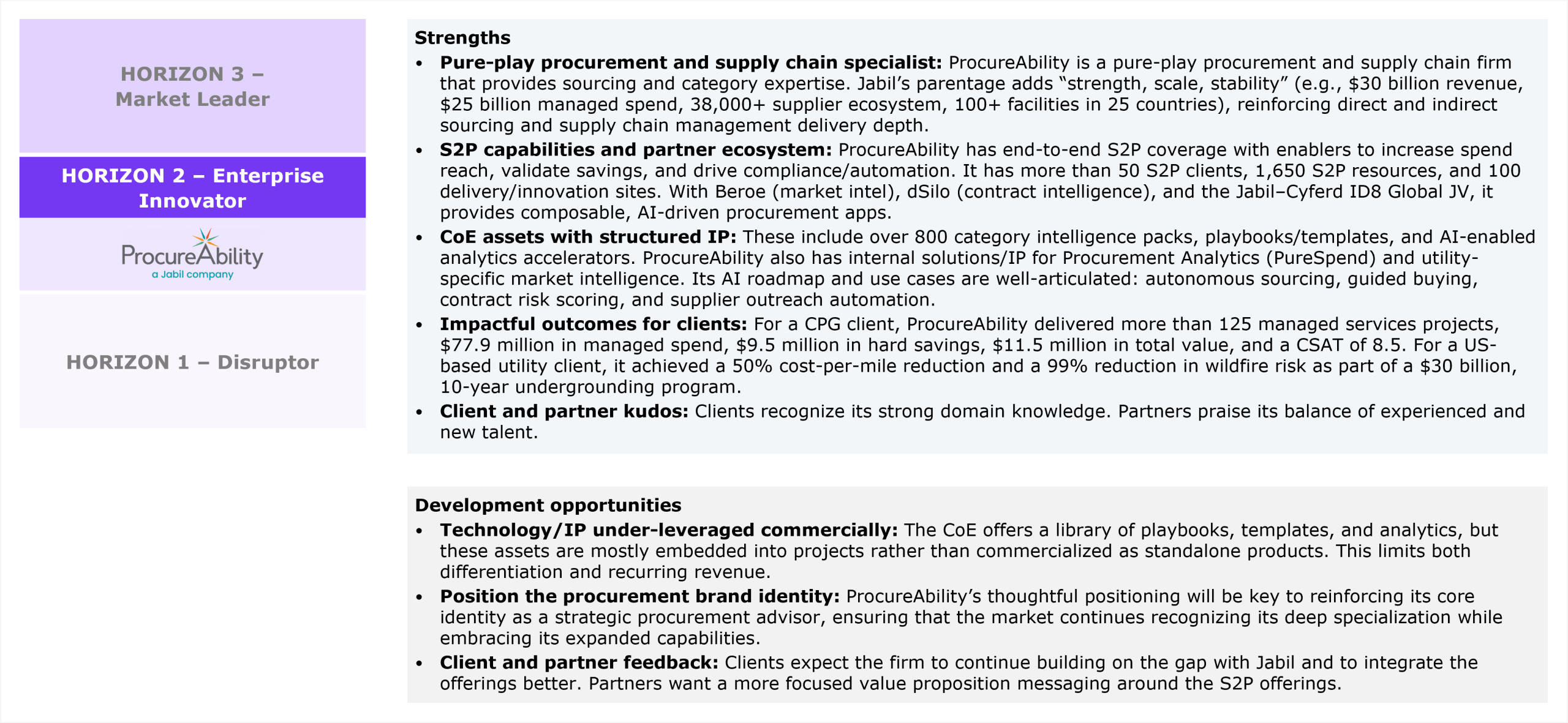 ProcureAbility’s performance in the study and HFS’ views of its strengths and development opportunities for sourcing and procurement service capabilities