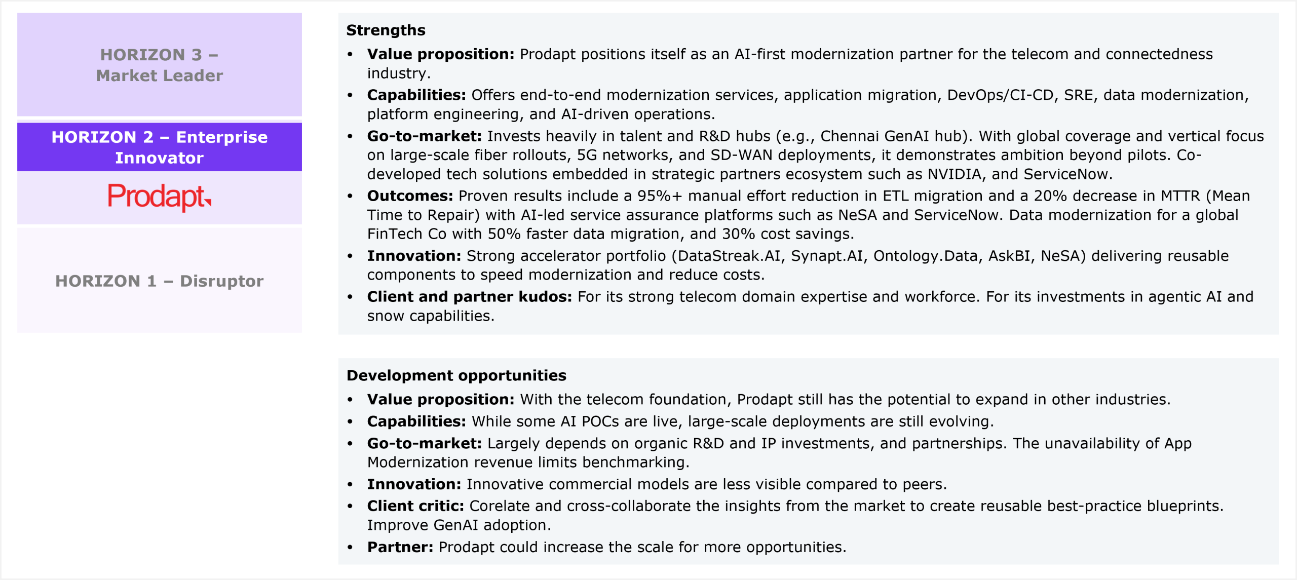 Prodapt’s strengths and development opportunities, as per HFS’ analysis, in legacy application modernization services capabilities